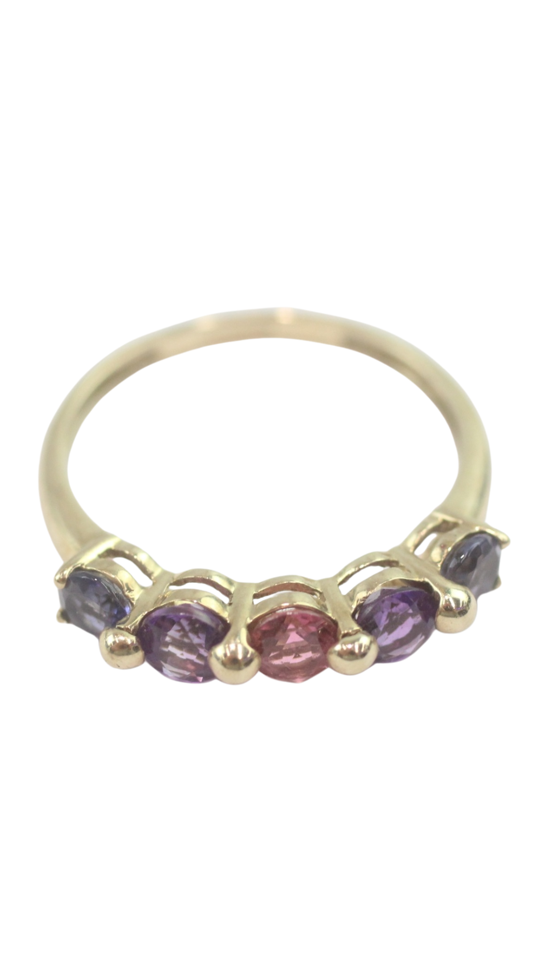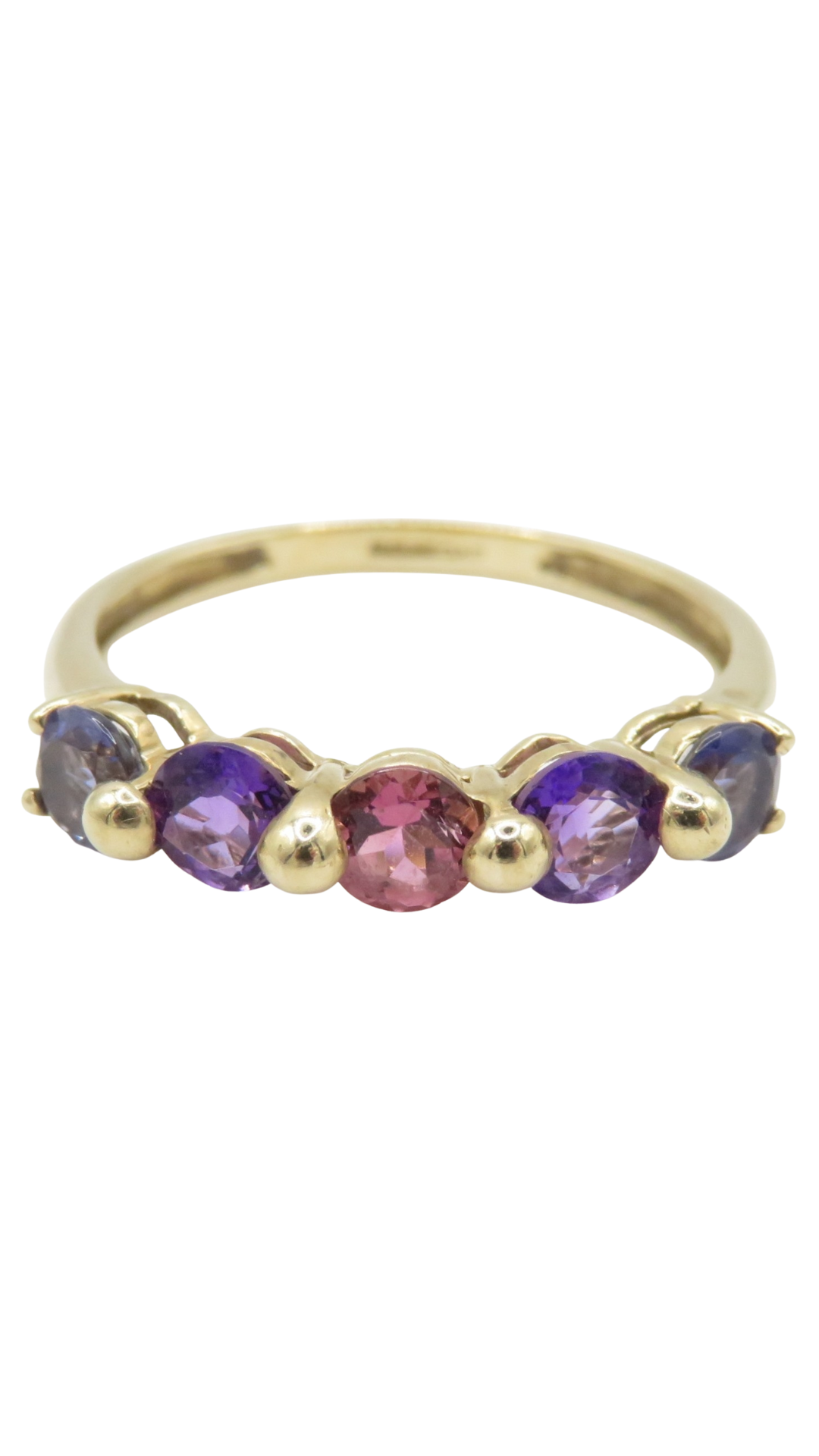 9ct gold amethyst, iolite, and tourmaline set five stone ring (1.7g) Size 8