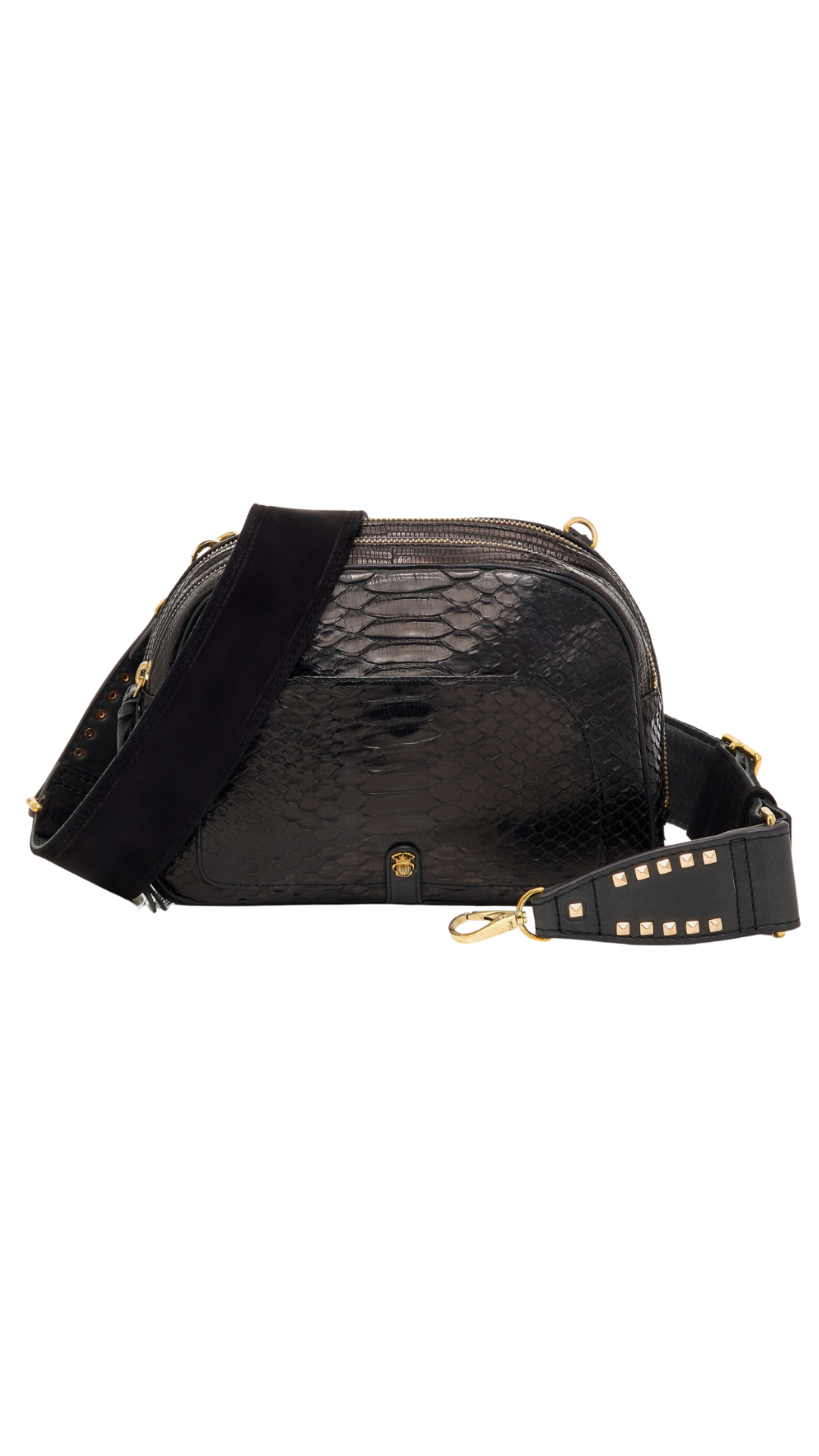 Made of python and suede calfskin. Organized into two compartments with an internal zippered pocket and a front pocket adorned with a brass beetle jewel. The back features 3 slots for cards and papers.