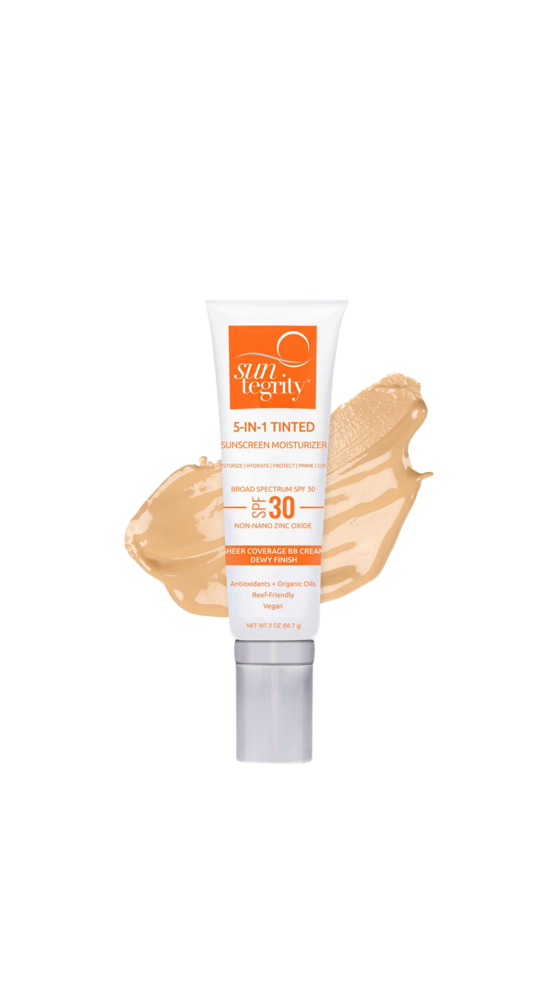 Discover the perfect blend of skincare and sun protection with Suntegrity’s 5-in-1 Tinted Sunscreen Moisturizer. This multi-tasking BB cream renews, hydrates, primes, and protects while delivering flawless coverage. Infused with powerful antioxidants, including Hyaluronic Acid and Astaxanthin, this cream helps to combat free radicals and promote healthy, youthful skin. The non-nano Zinc Oxide provides effective Broad-Spectrum SPF 30 protection against harmful UVA and UVB rays while soothing redness and irritation.