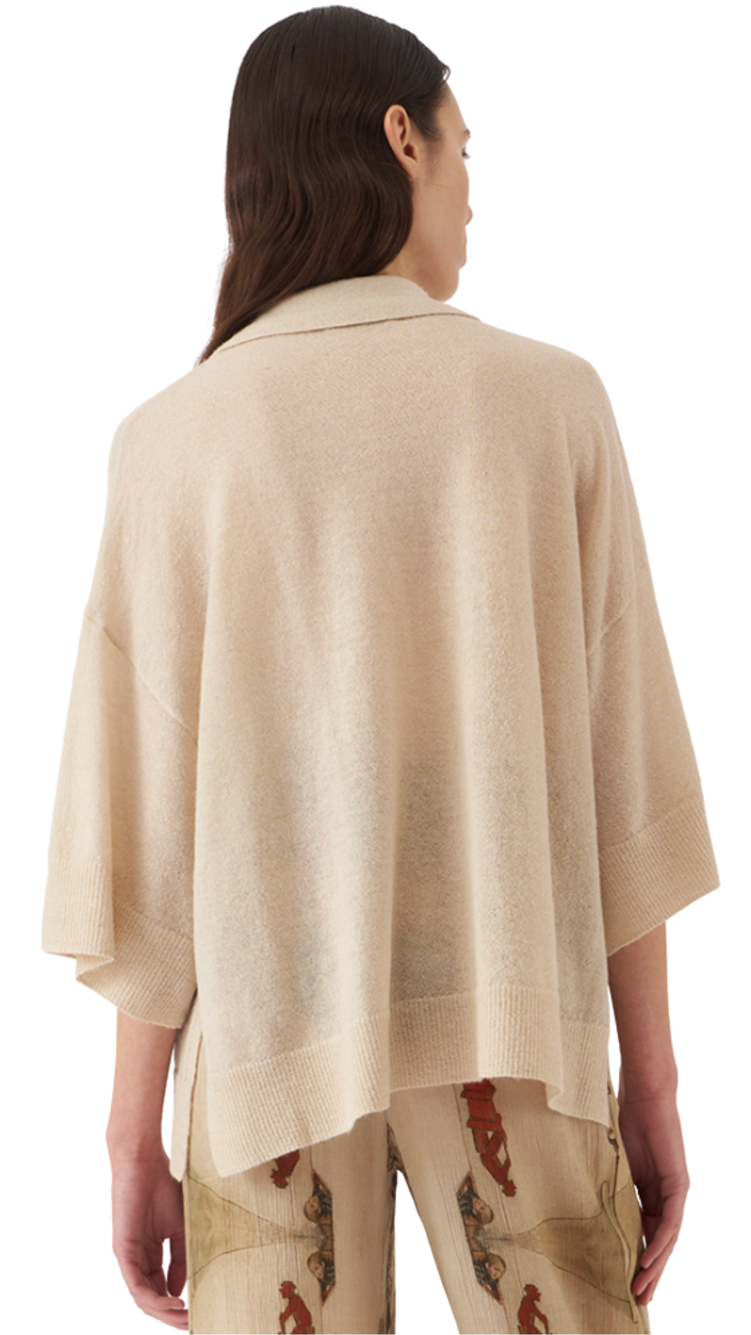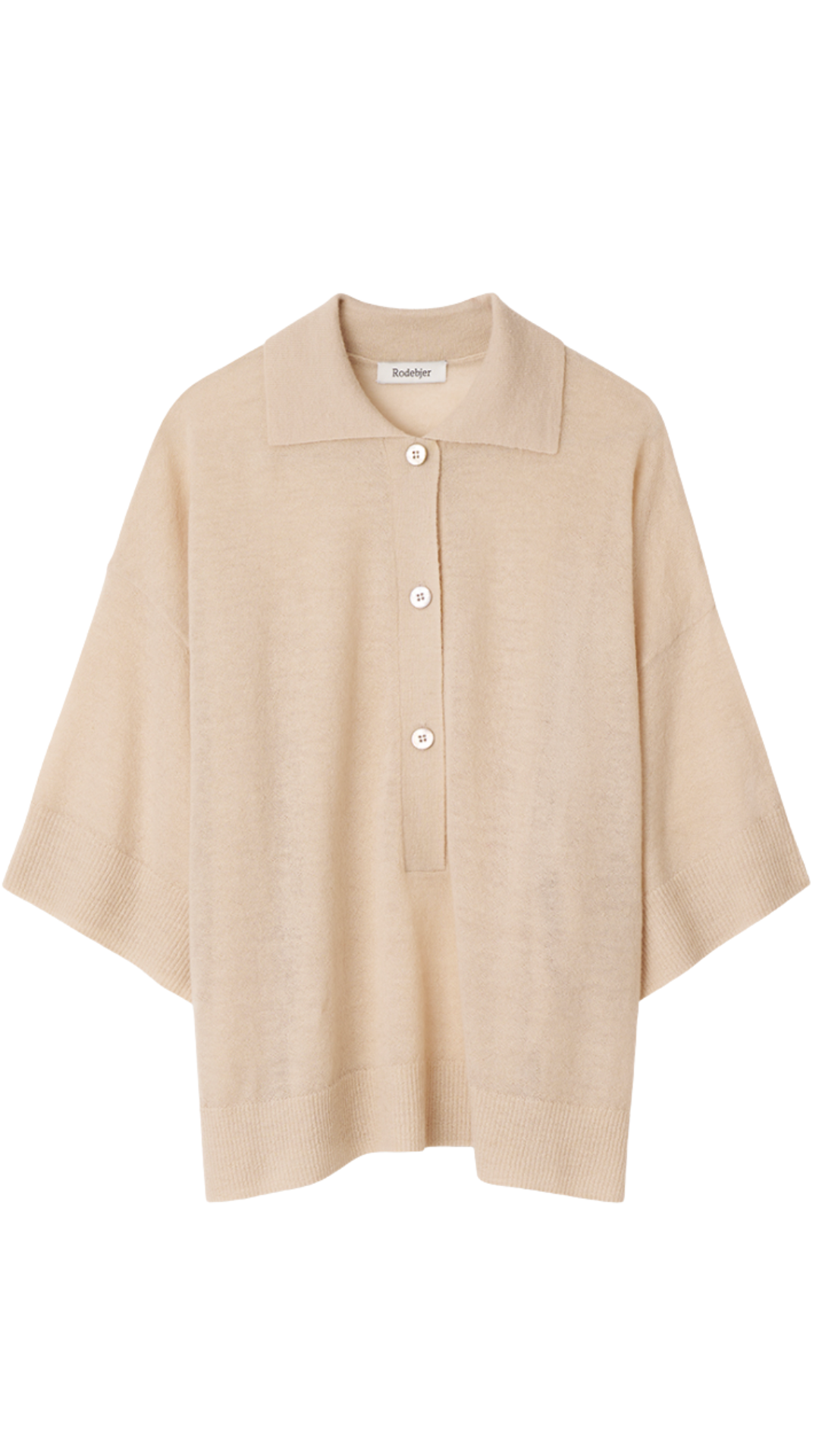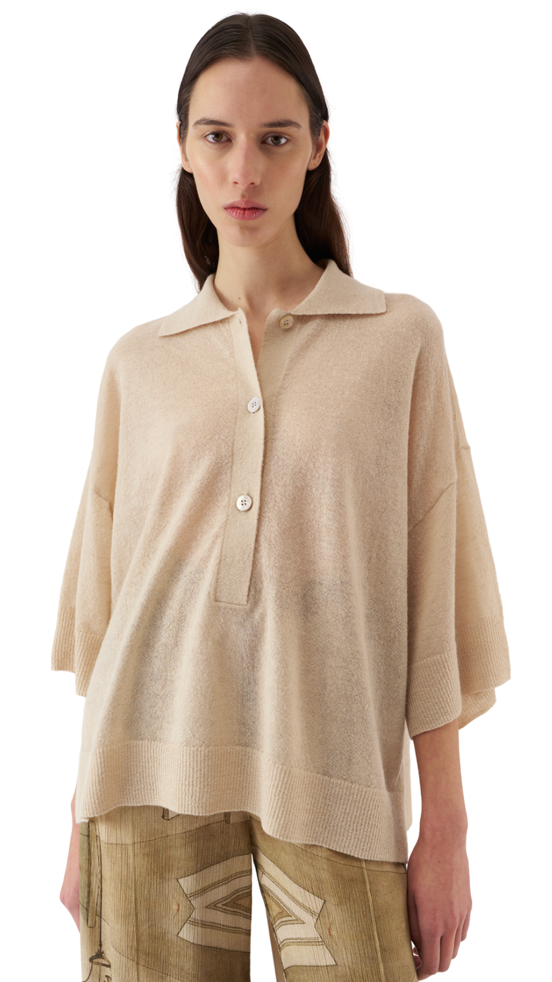 Welcome the transitional season with the soft and tactile Adore sweater. Knit from a fine blend of alpaca and merino wool to a boxy silhouette, this short-sleeved style has a polo neckline that will add contrast to flowing skirts.
