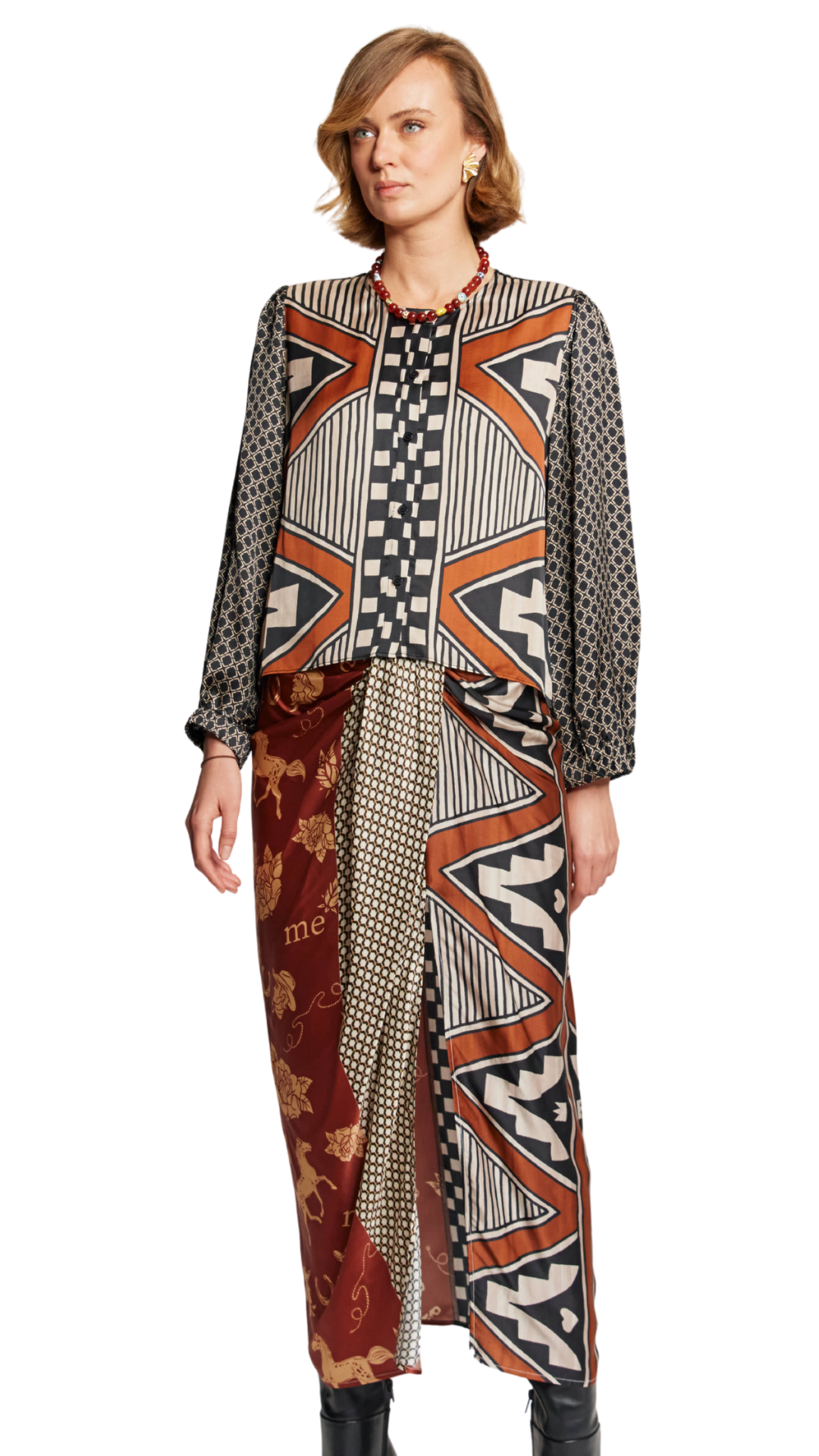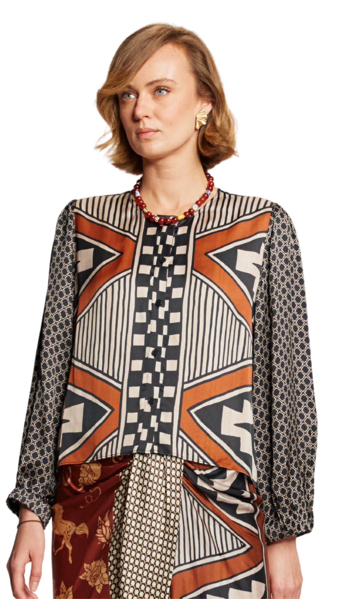Avia button down top is cropped with a round neck and puffy long sleeves with elastic at the wrists. Pair with our Luna Rodeo tie front skirt for an elegant elevated look.