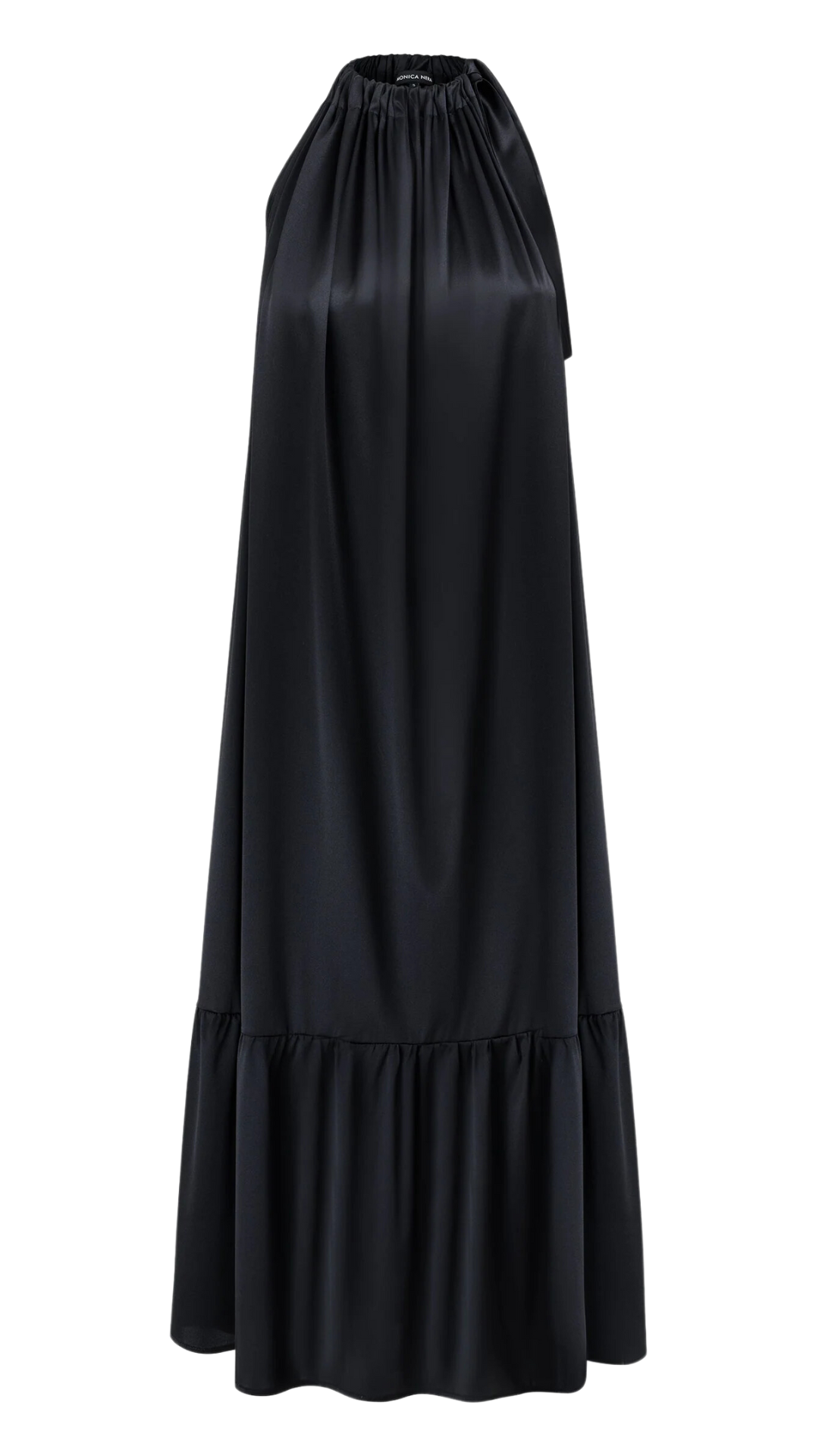 Made with high-quality silk fabric, this stunning dress features a flattering halter neckline with ribbon tie shoulders that create a ruching effect. The single-tier skirt and airy loose silhouette add a touch of sophistication while the midi length is perfect for showing off your favorite heels, sandals, or even sneakers. 94% silk, 6% elastane