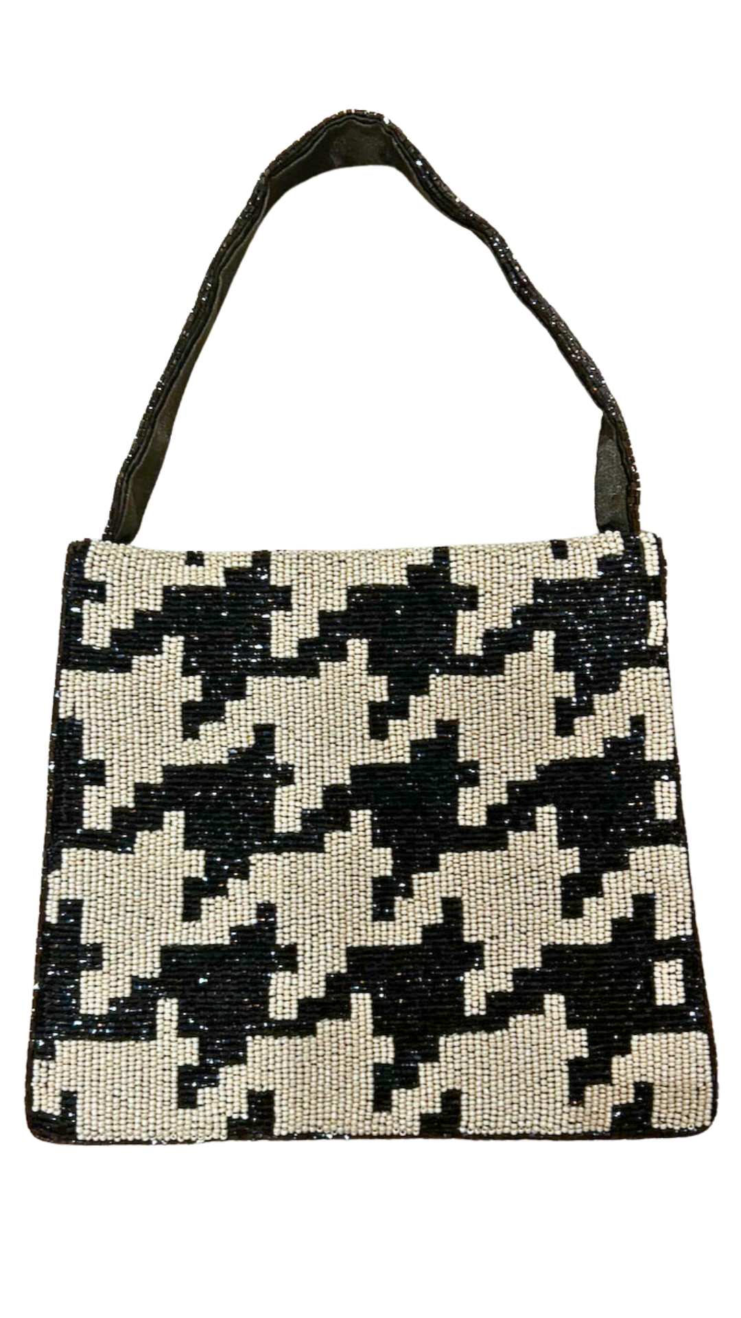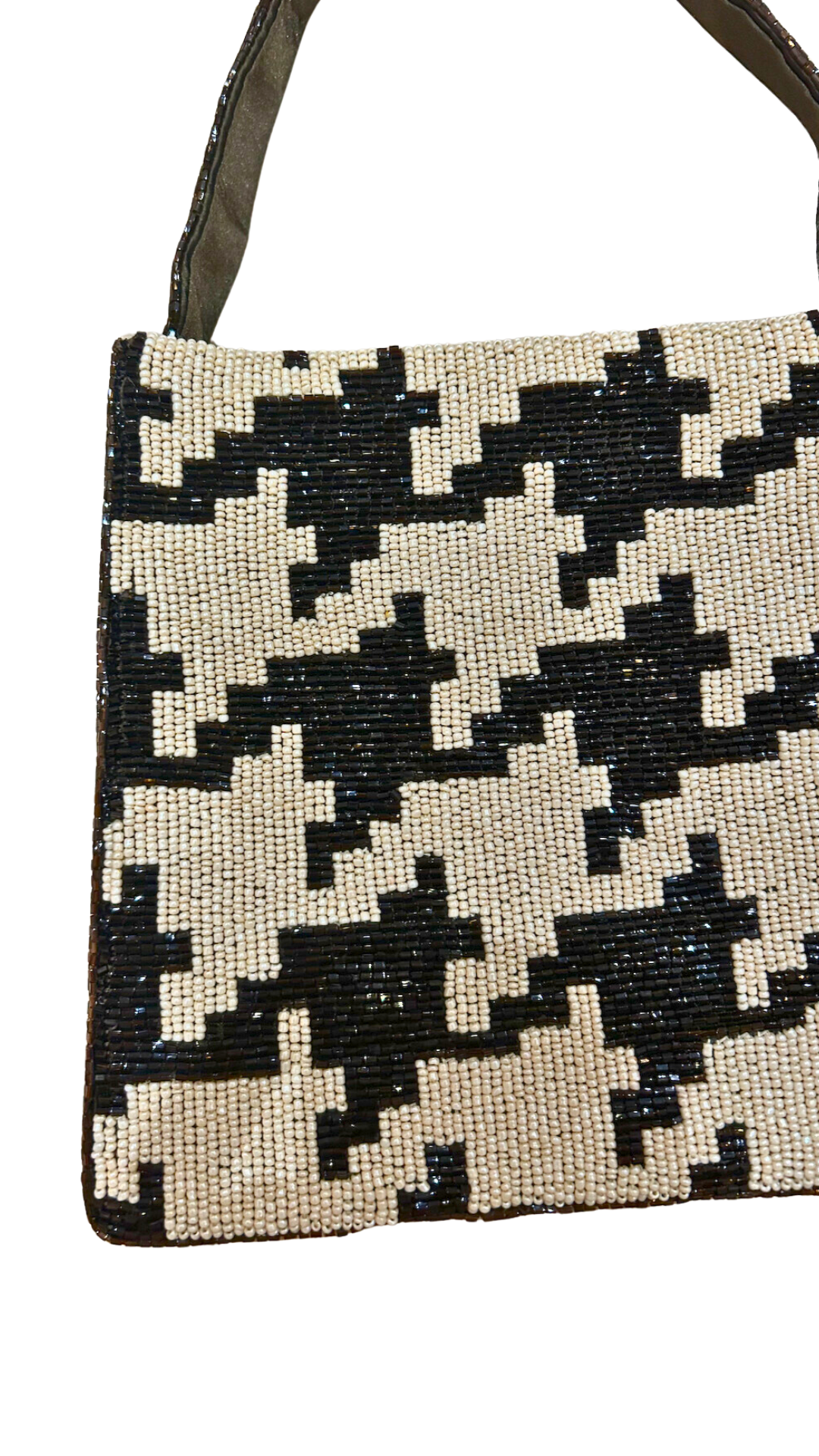 Brown houndstooth printed beaded shoulder bag. Magnetic closure.