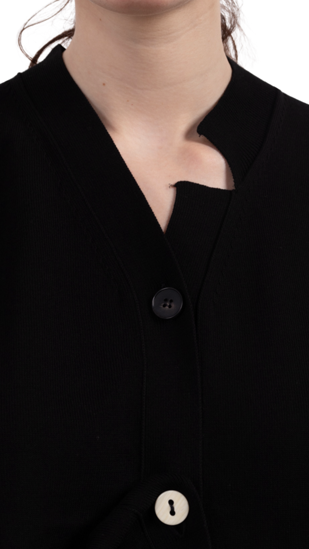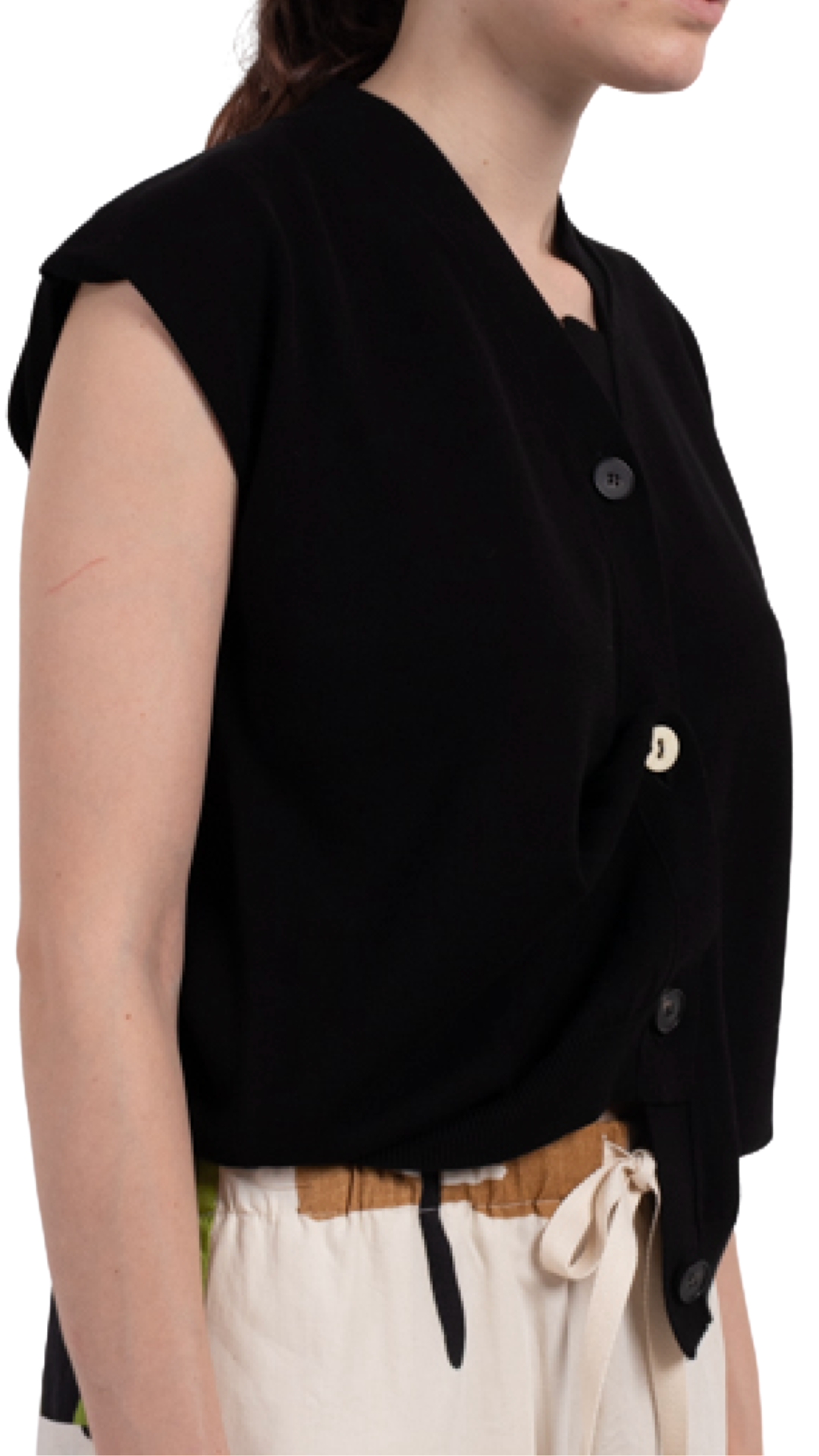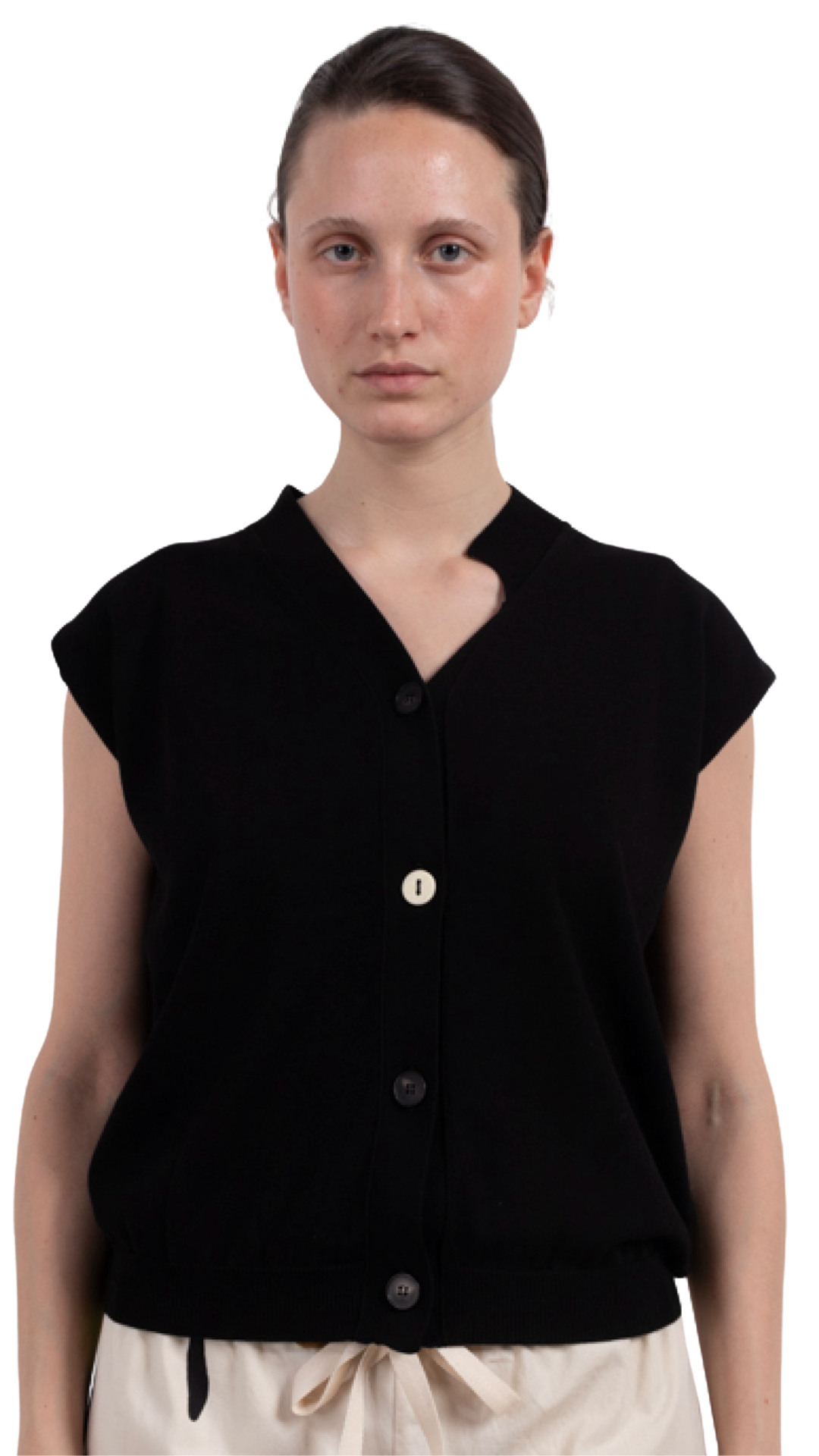 100% cotton, button up sleeveless sweater with cut out neckline. A fun play on a simple basic.