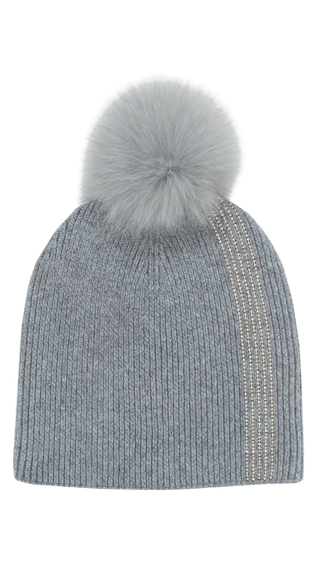 HAT WITH CRYSTAL STRIPES & FOX FUR POMPOM