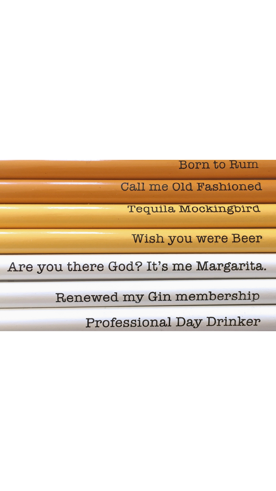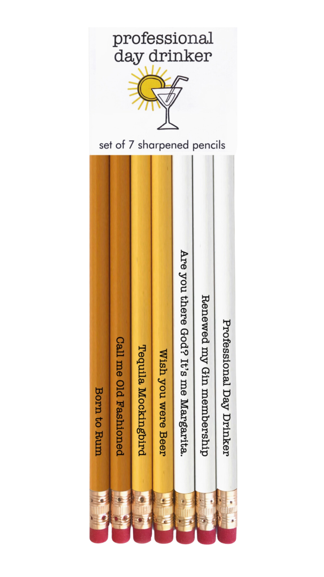 Don't quit your day job ;) Carded set of 7 sharpened #2 pencils in cello bag | 2.5” x 7.5" Set includes: Born to Rum / Call me Old Fashioned / Tequila Mockingbird / Wish you were Beer / Are you there God? It’s me Margarita. / Renewed my Gin membership / Professional Day Drinker