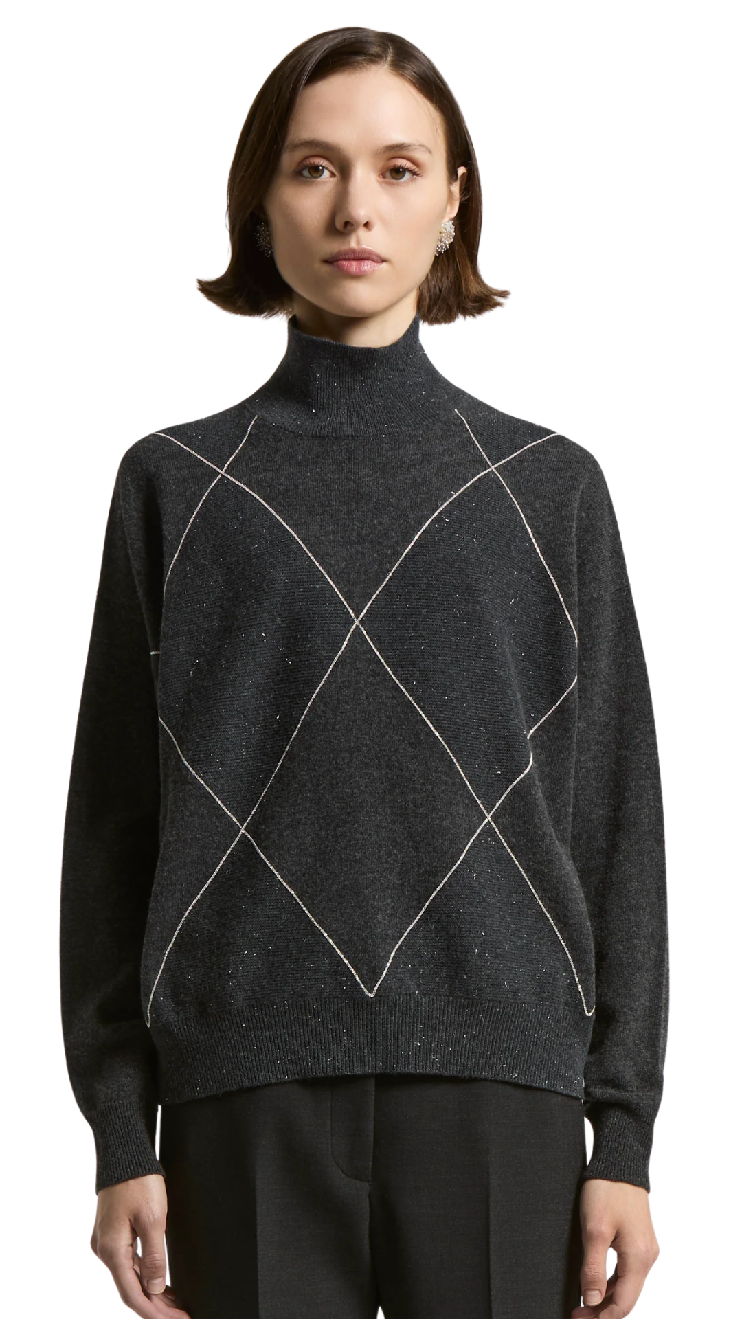 The lurex yarn adds delicate elegance and shimmer to this jumper in two shades of grey, creating a texture that serves as a backdrop to the silver maxi-diamond design.