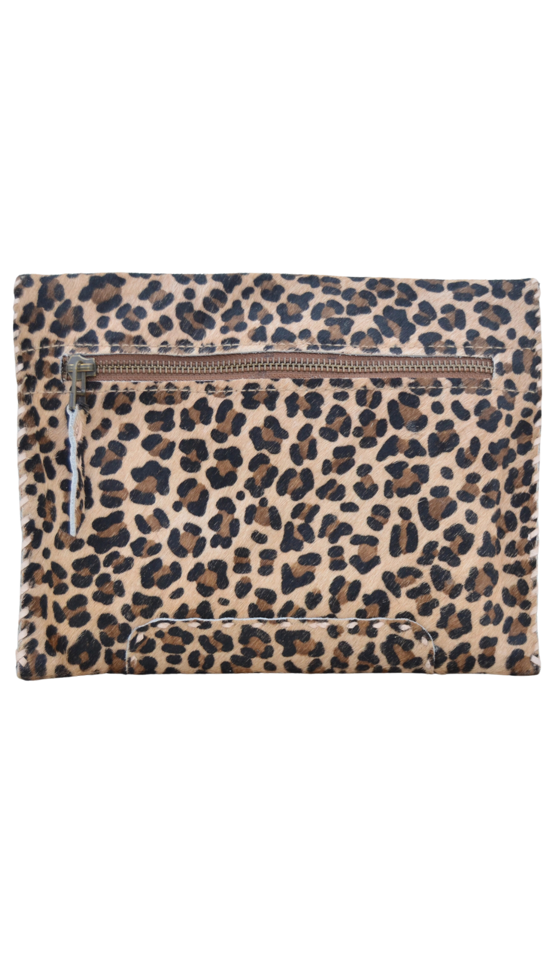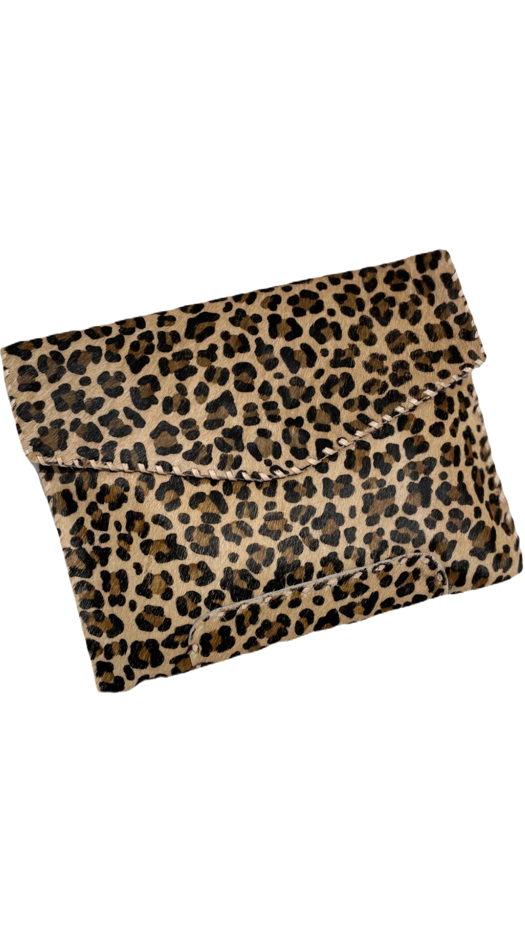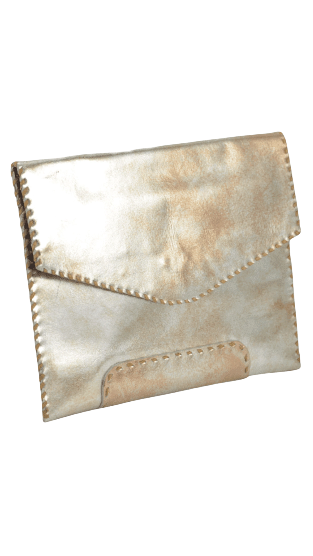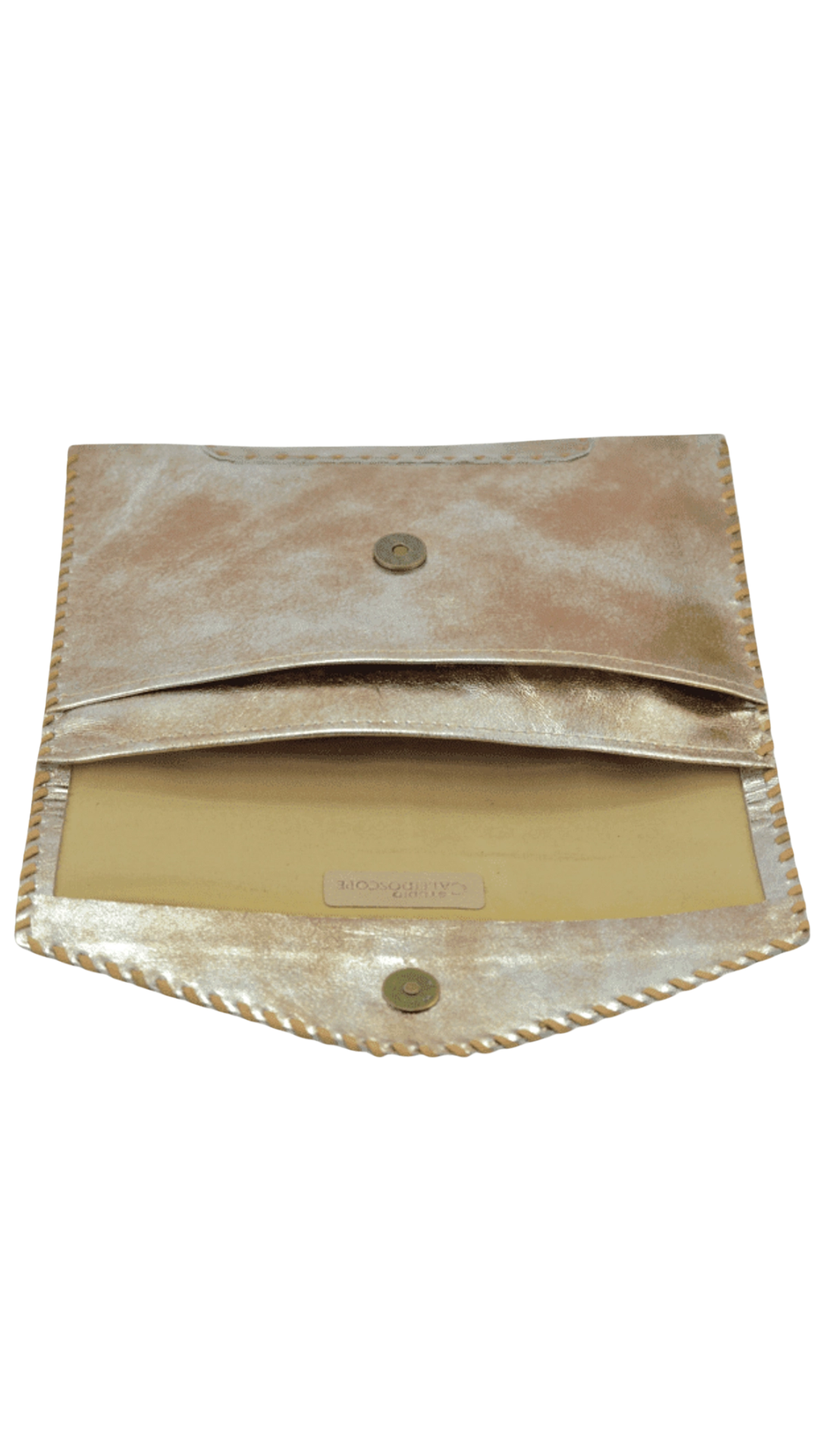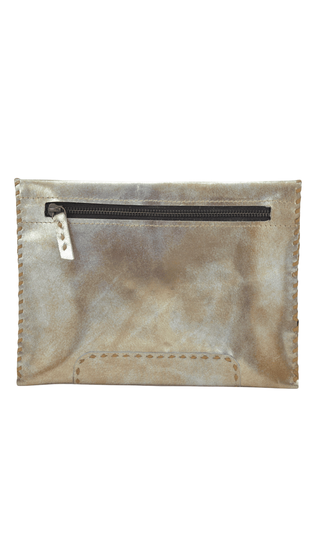 Artisan Handmade clutch. Made with cowhide hairon leather and metallic leather, cotton lined. Hand-stitched using leather strips creating beautiful whipstitch detailing. Snap button closure 2 compartments Back zipper pocket Size: 9.75"X7". Made in India