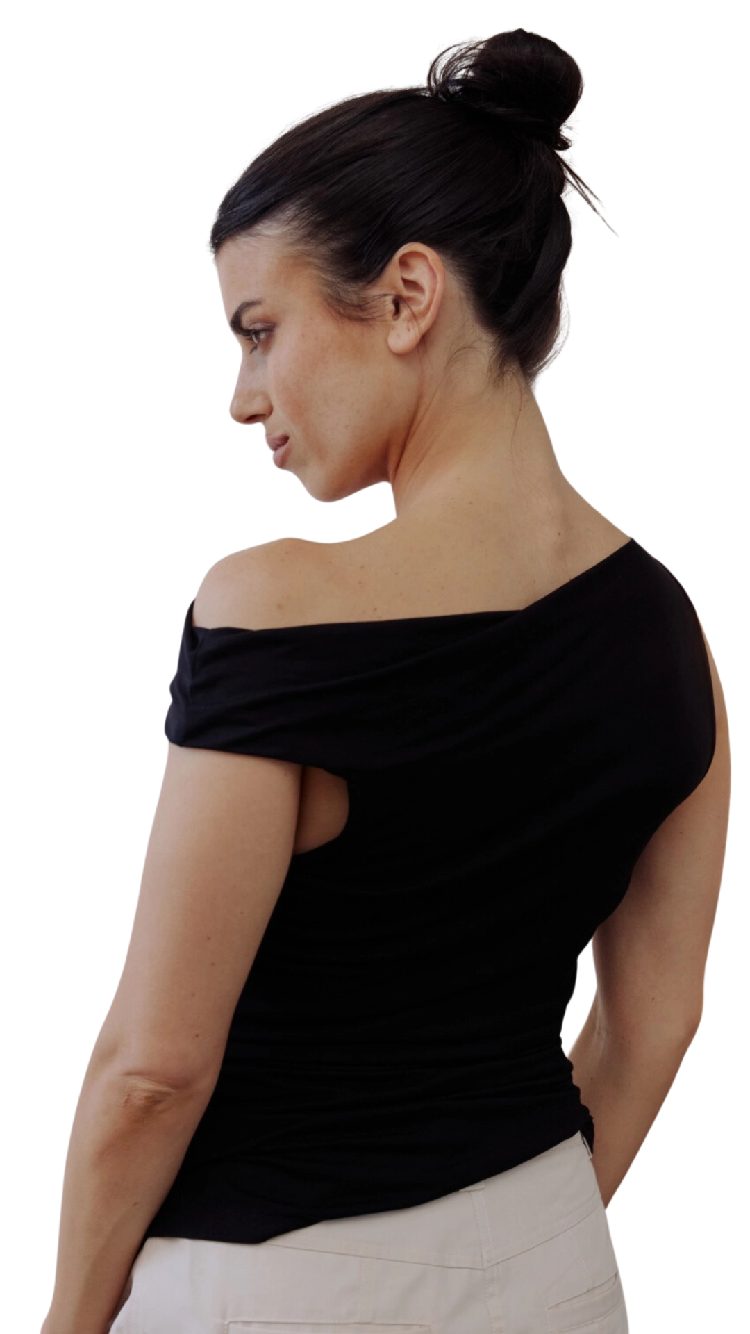 The Emilia Top is a fitted top that is made from a soft, stretch modal-blend fabrication. It boasts an asymmetrical twist shoulder and ruched at the waist. An easy summer style to pair with linen shorts and mini skirts.