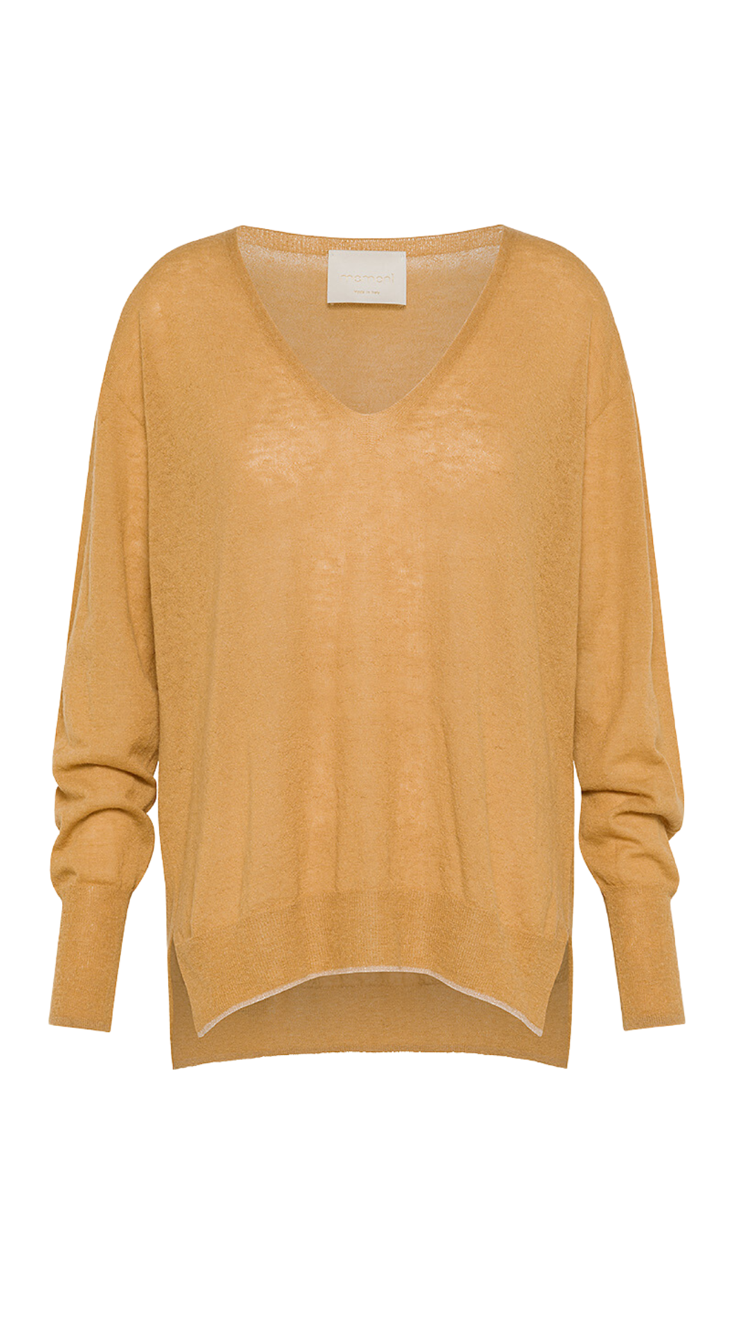 Oversize sweater in plain knit light wool and alpaca blend yarn. Slightly rounded V neck, side slits and slightly longer back. A delicate touch of contrast colour lurex on the hem. Made in Italy.
