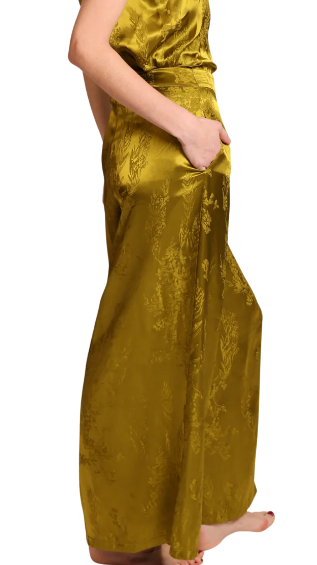 Our Evie trousers are back with the most comfortable wide leg fit. Featuring a flat front mid-rise waistband with elastic in the back to allow for a more comfortable fit. They have the essential side pockets and are finished with a side zip fastening. So stunning in this luxurious olive green floral fabric. Pair with the From A Distance Grace Top.