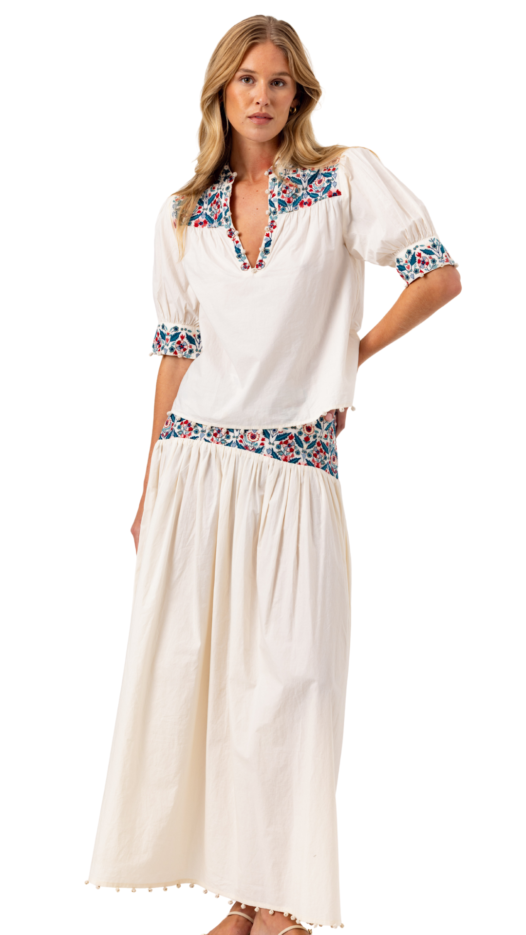 An elevated take on the classic maxi skirt, the Gwen Skirt features floral embroidery details and is an essential breezy style.