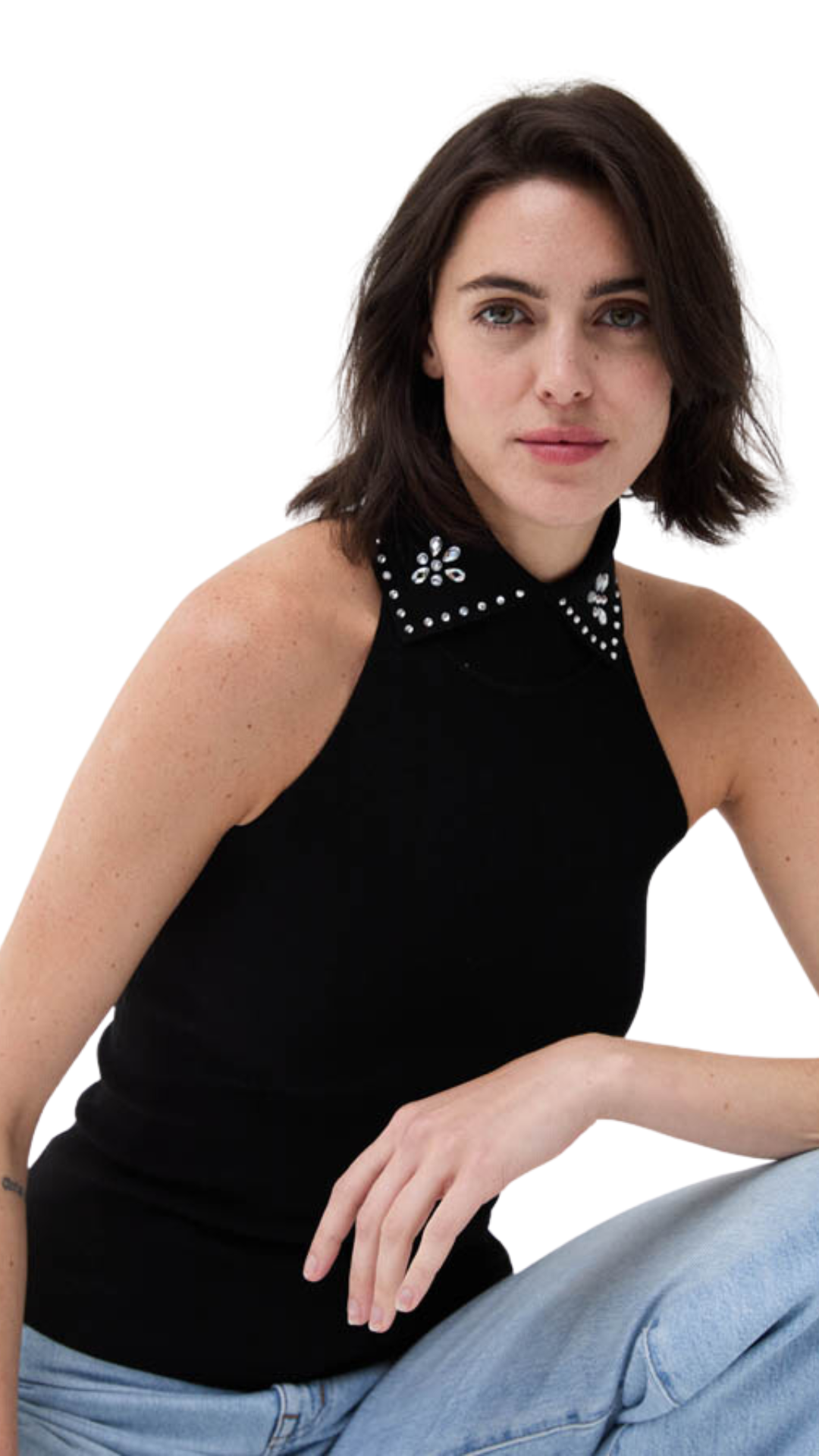 Put a spin on your typical black tank with this top. The collar is embellished with crystals to add a party to your outfit.