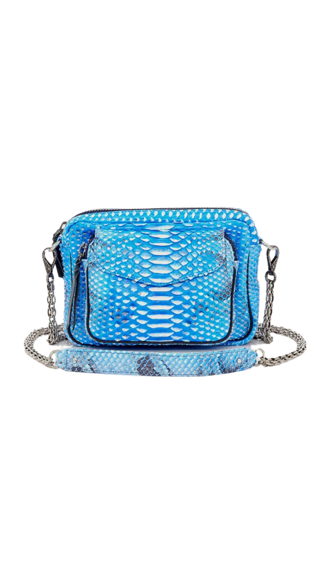 Bag made of python leather in light blue with white and black highlights. It is organized in a compartment with a pocket in the front and equipped with a golden handmade chain and many storage spaces that will facilitate your life.