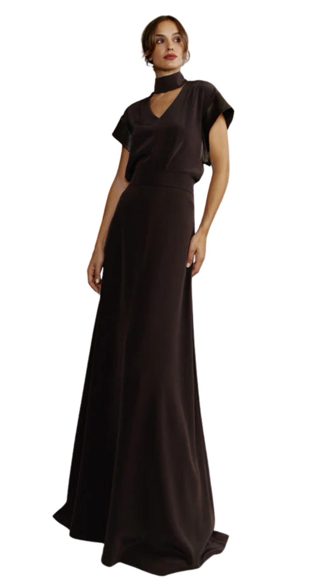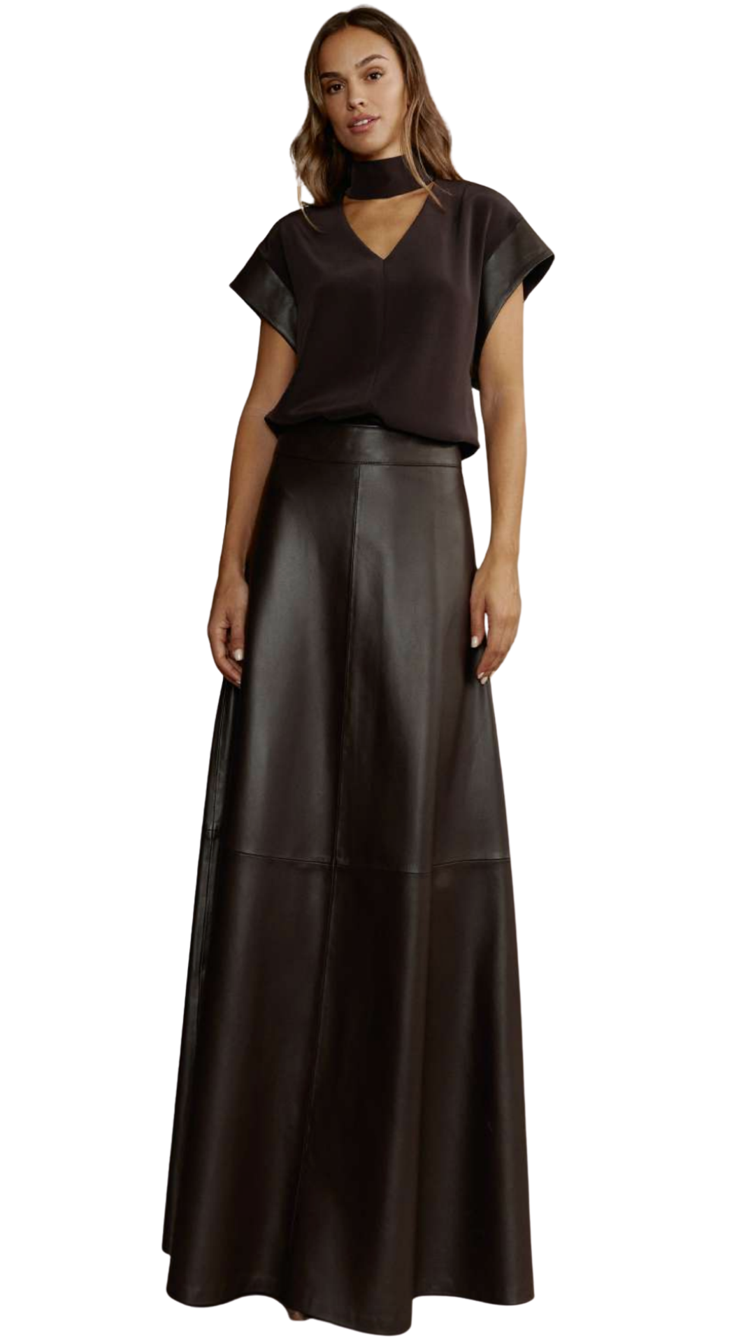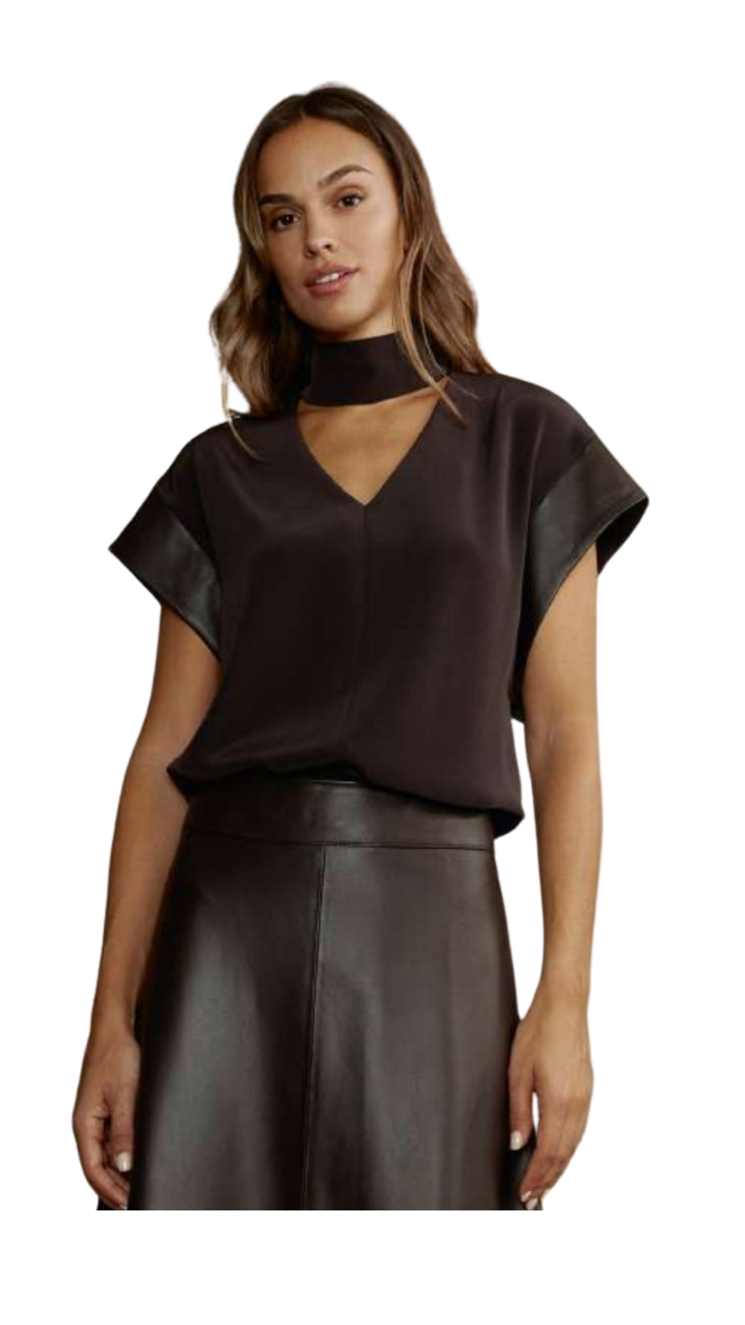Sleeveless top with a gathered neckline trimmed with a dark brown leather trim. Composition: 80% Triacetate, 20% Polyester Leather trim: 100% Lambskin.