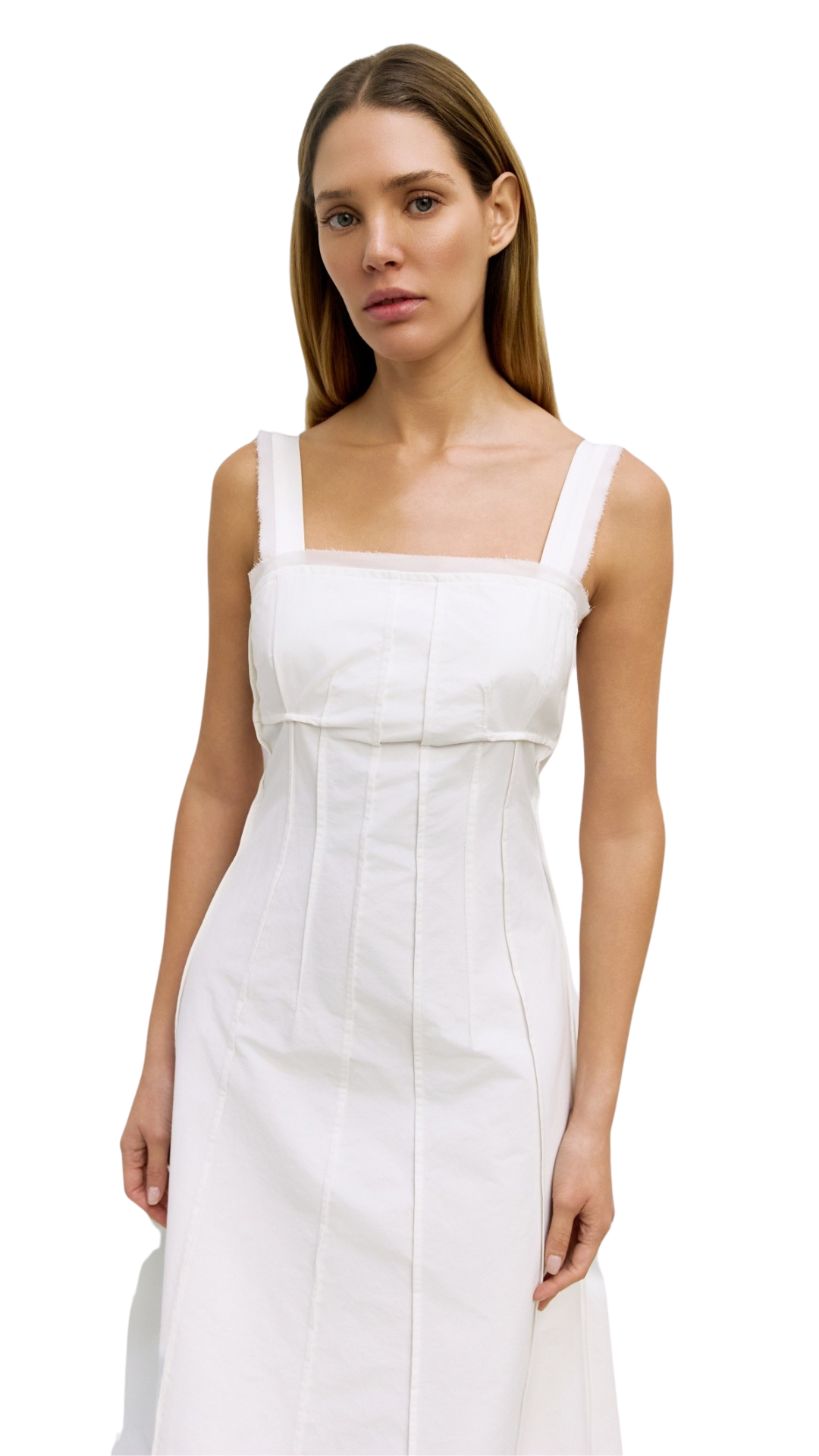 The Meredith Dress is crafted from heavy cotton-nylon with a structured drape and a fitted waist and bust. A square neckline trimmed with chiffon flows into a paneled A-line skirt with pintuck detailing at the bust, secured with a side invisible zipper.