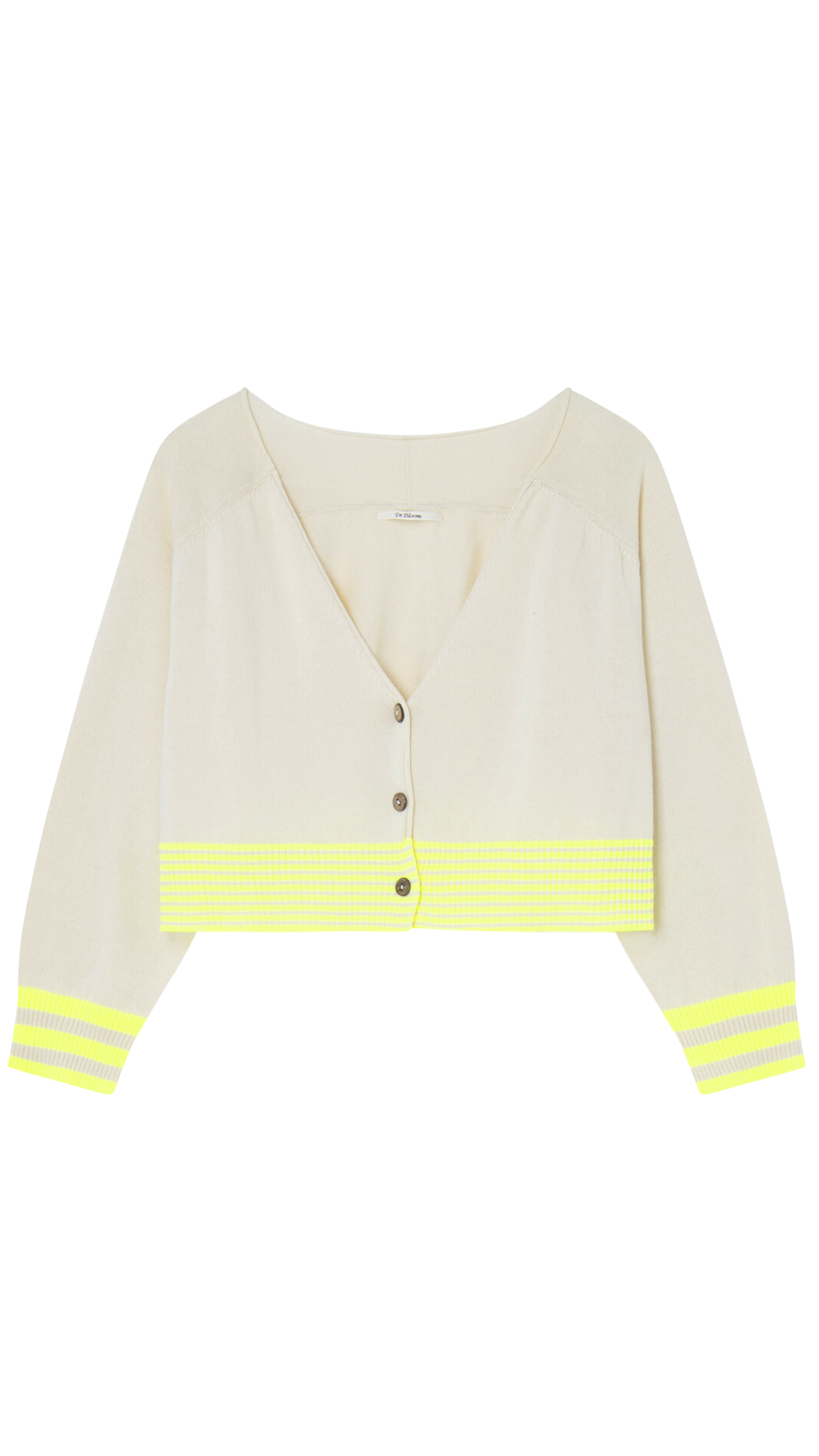 Wide-cut, cropped twin-set cardigan. V-neck, coconut buttons, and contrast stripe