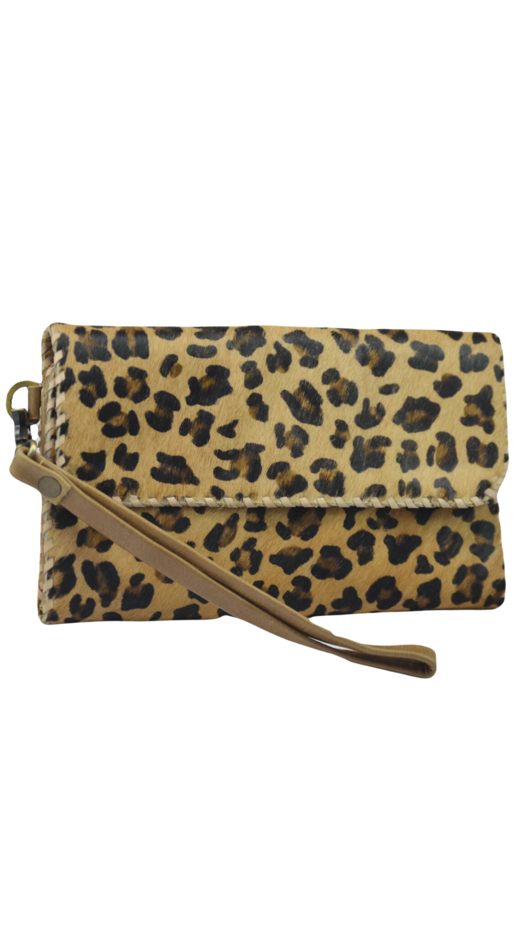 Artisan Handmade trifold wallet with cotton lining. Made with cowhide hairon leather. Hand-stitched using leather strips creating beautiful whipstitch detailing. Magnetic Closure Compartments 2 Zipper Pockets 6 credit card slots Detachable wristlet Size: 7.5"X 4.5". Made in India