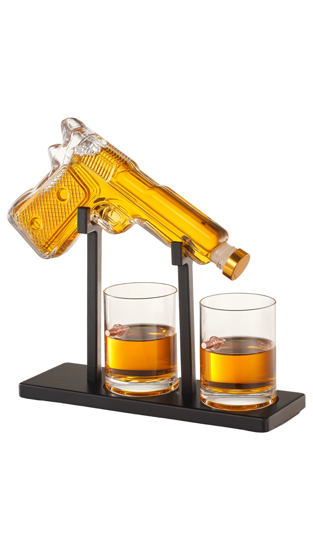 The perfect gift to give or receive: How about a gift for birthdays, Father's Day, anniversaries, Christmas, etc.? A gift that is both decorative and practical to impress your loved ones. The Wine Master presents the Whiskey Decanter Set! We will answer your gift questions. a gift to remember Refresh your home bar with this sleek, pistol shaped glass decanter. Crafted of fine clear borosilicate glass, the decanter features a bubble knob. This remarkable piece comes with a matching pair of glasses each holding 10.5 OZ, each fashioned in its own right. Standing approximately 9 inches tall and holds 7.7 OZ, this is sure to become a conversation starter at your next gathering. Enjoy a drink in style with this sophisticated set that will add style to any bar or party. Ideal for collectors and enthusiasts, this Decanter & 2 whiskey glasses paired with a wooden display stand is the perfect companion for your next cocktail party.