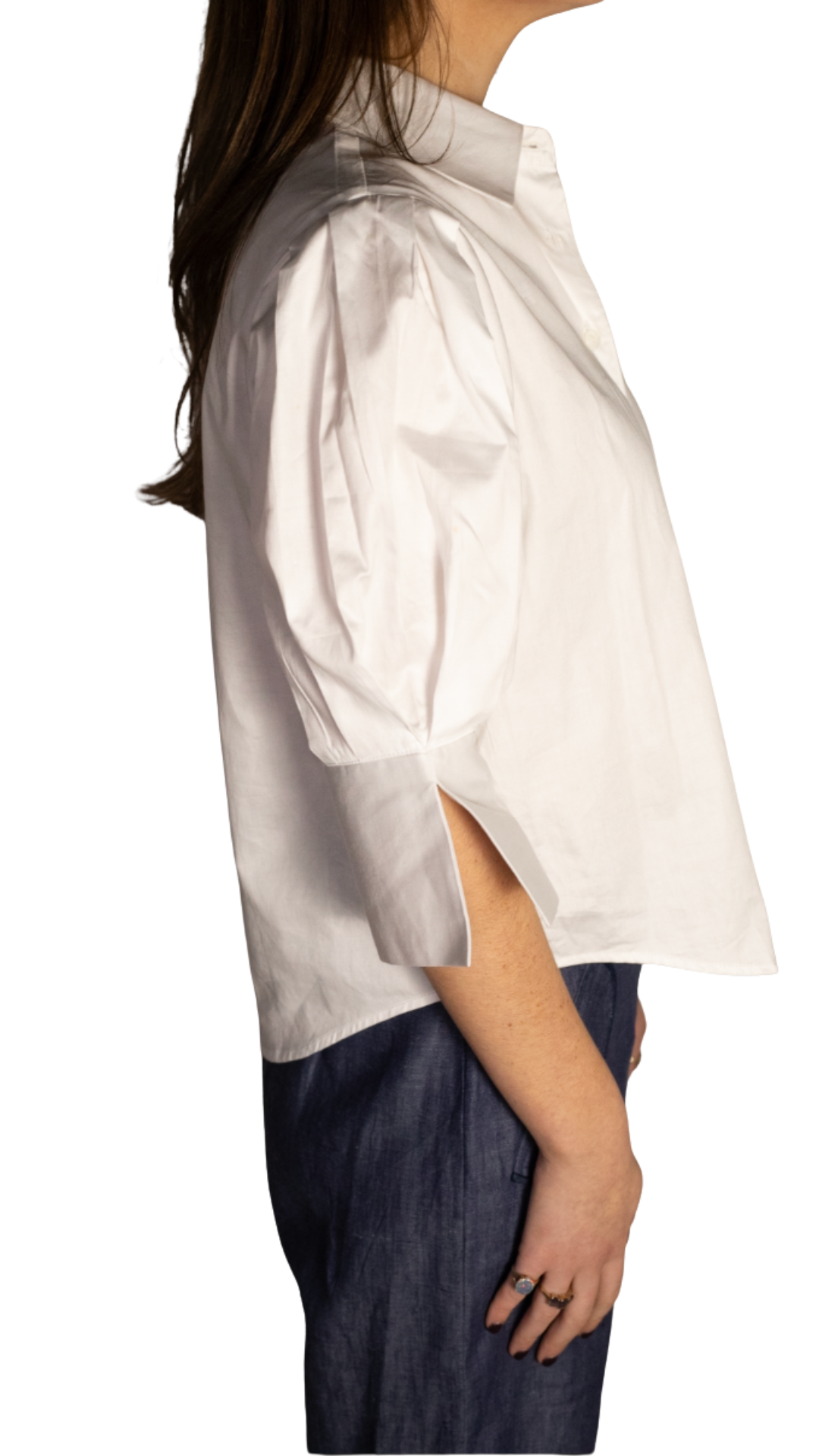 The Rudie Top is a crisp white button-down shirt with a modern, feminine silhouette. It has a classic pointed collar with a full button-front closure for a timeless look. Features a relaxed, slightly boxy shape that drapes away from the body for an effortless feel, and three-quarter–length sleeves with soft volume and dramatic wide split cuffs. It's made with smooth, lightweight or cotton-blend and a straight, cropped-to-hip length that pairs easily with high-waisted trousers or denim. The Rudie top feels polished yet easy, an elevated take on the classic white shirt that works for both casual and dressed-up styling.