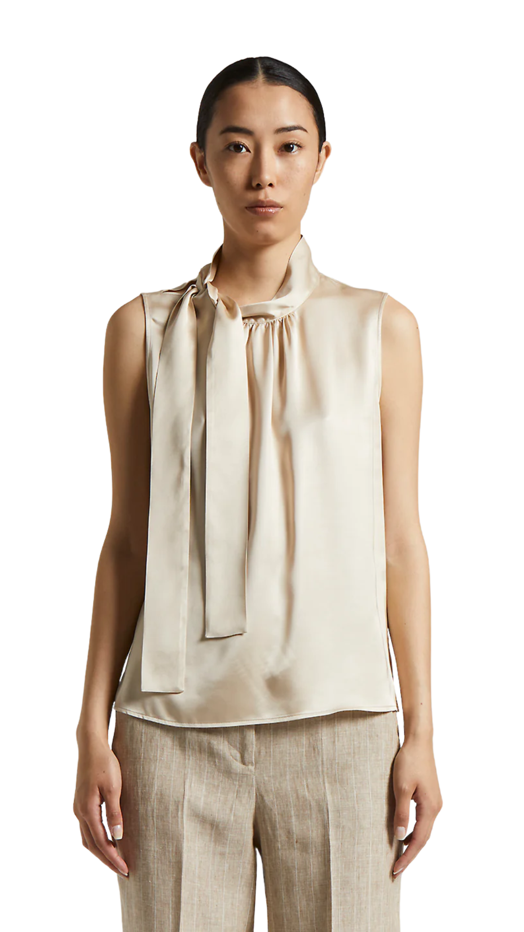 This sleeveless top in soft viscose satin is sophisticated and versatile. The tie at the neck with gathers at the neckline lend an original touch of sophistication.