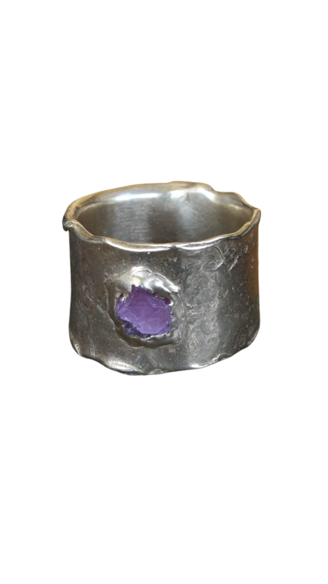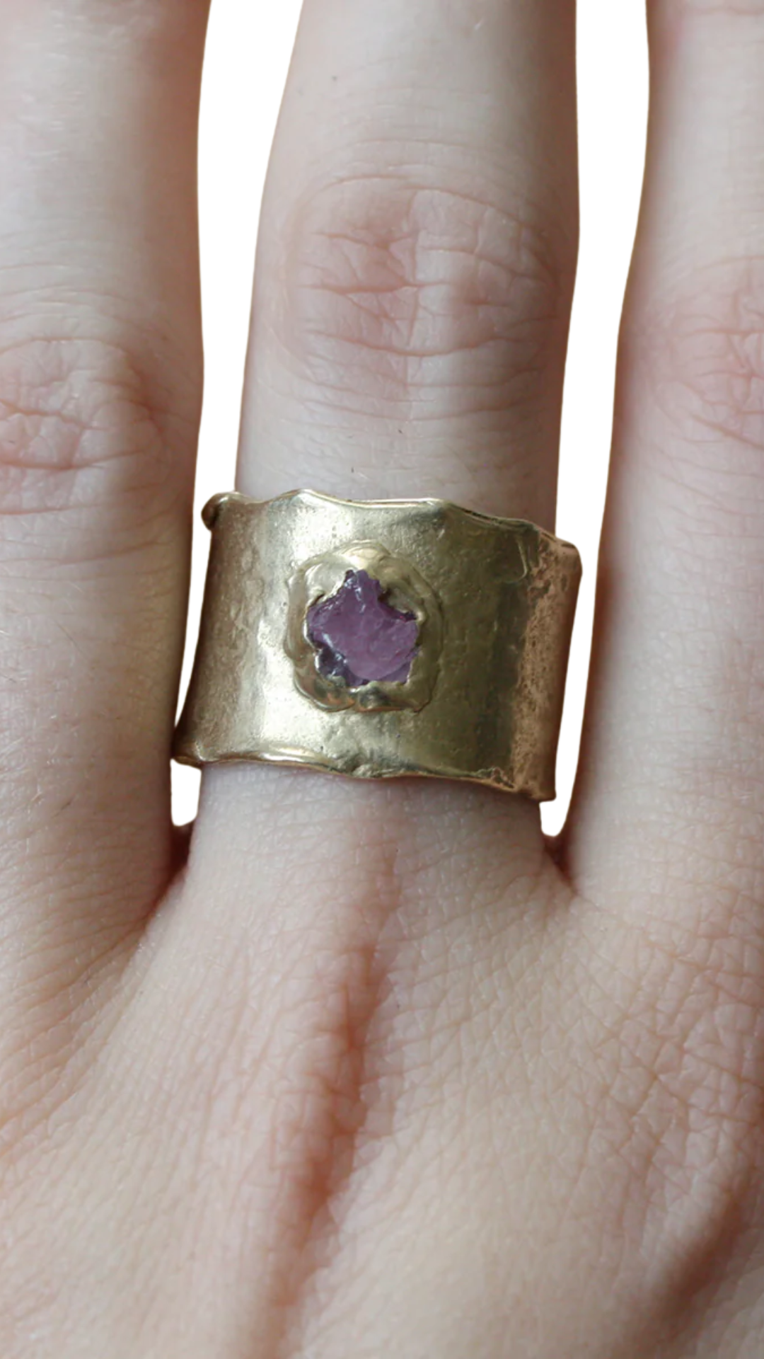 A rough ruby is embedded in brass to create this hand formed statement ring.