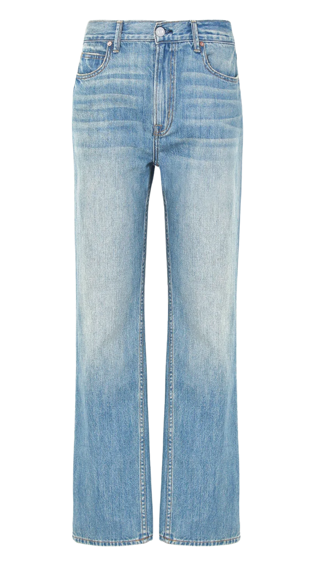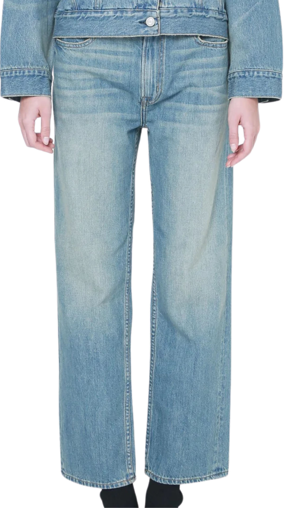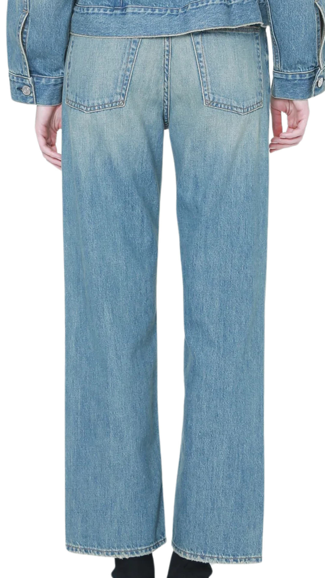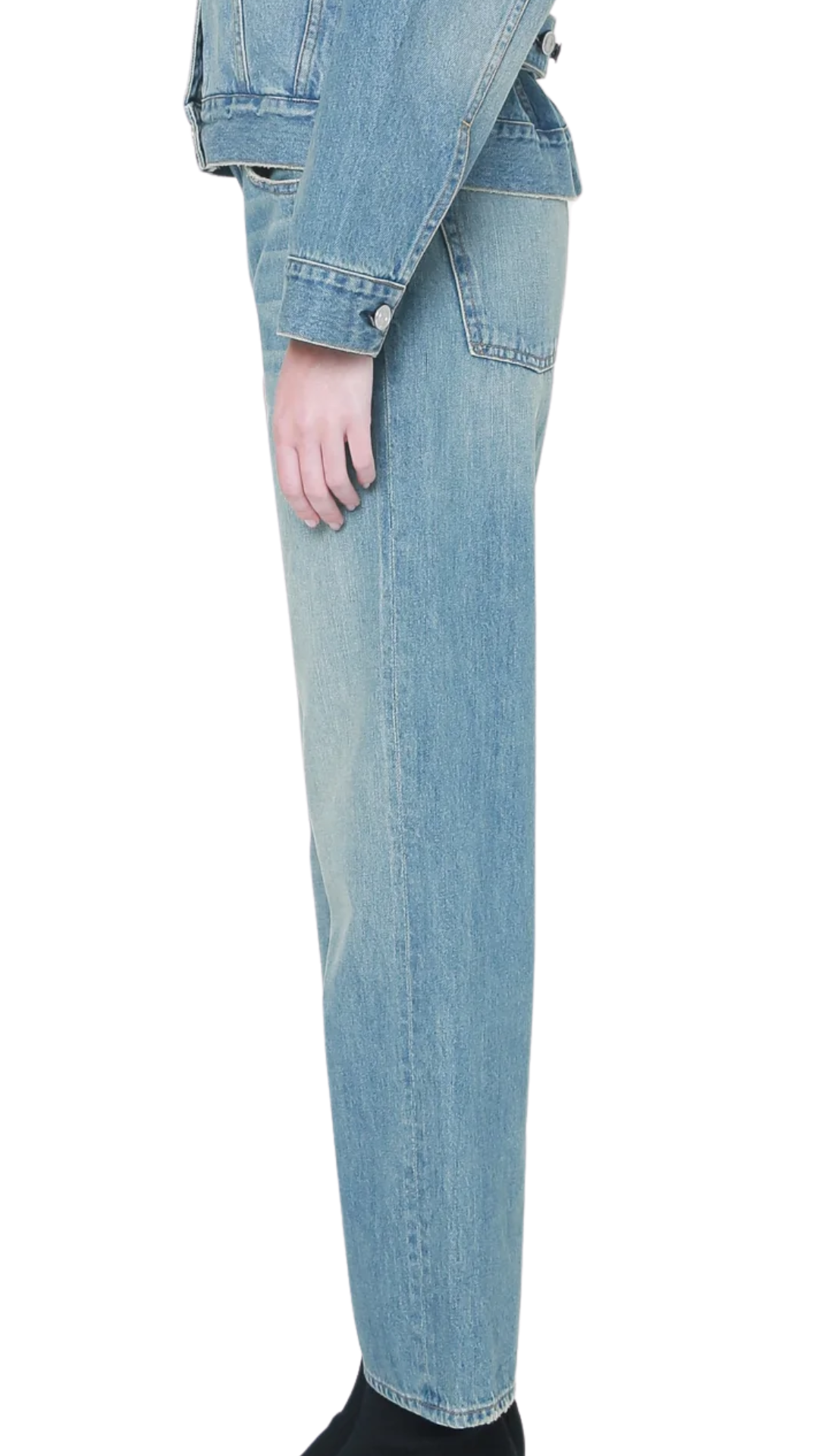 A relaxed straight fit that falls loosely around the waist and hips, gently tapering down for a comfortable and easygoing style. It features a light yellow-tinted treatment in a soft medium-light blue wash with an adjustable waistband on the back.