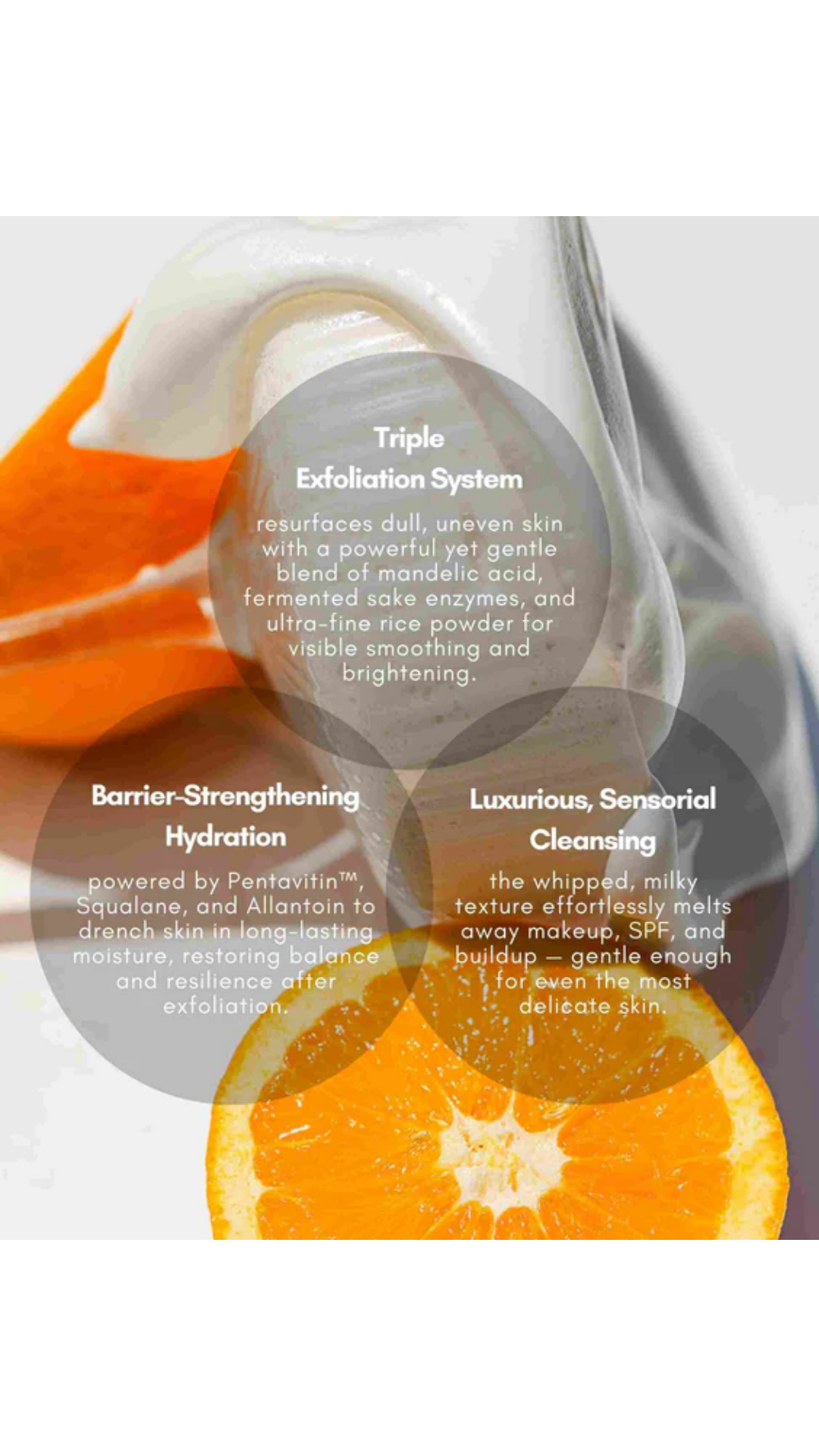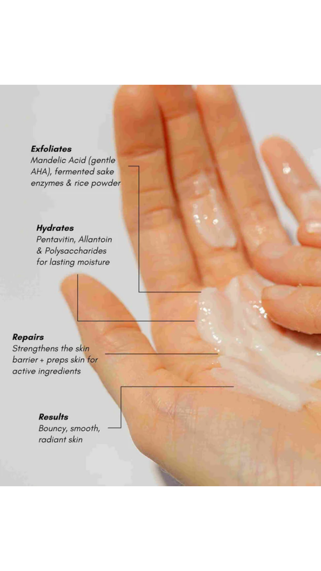 This gentle yet high-performance formula pairs Mandelic Acid and a Five-Fruit AHA Complex with Fermented Sake Extract and ultra-fine rice powder microspheres to visibly smooth, brighten, and resurface the skin without disrupting the skin barrier.