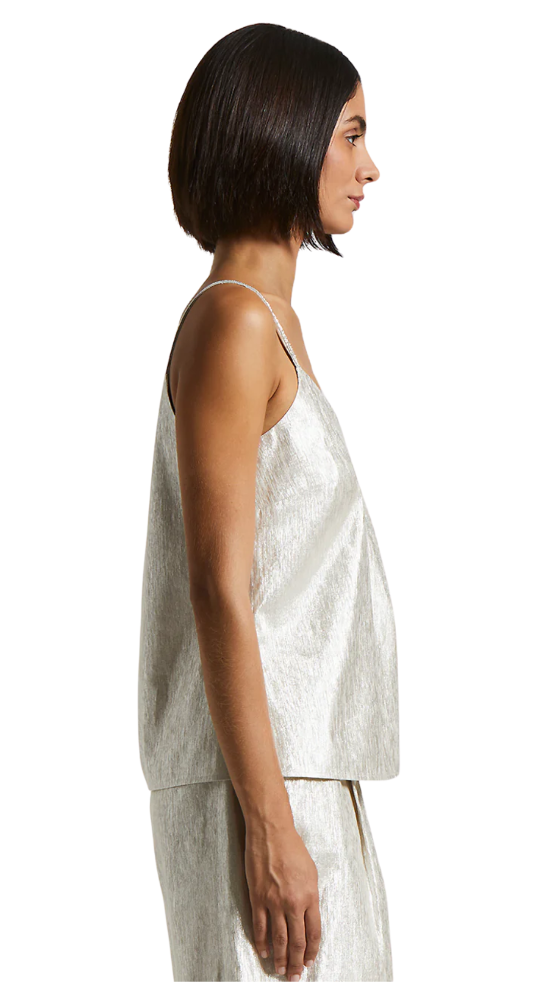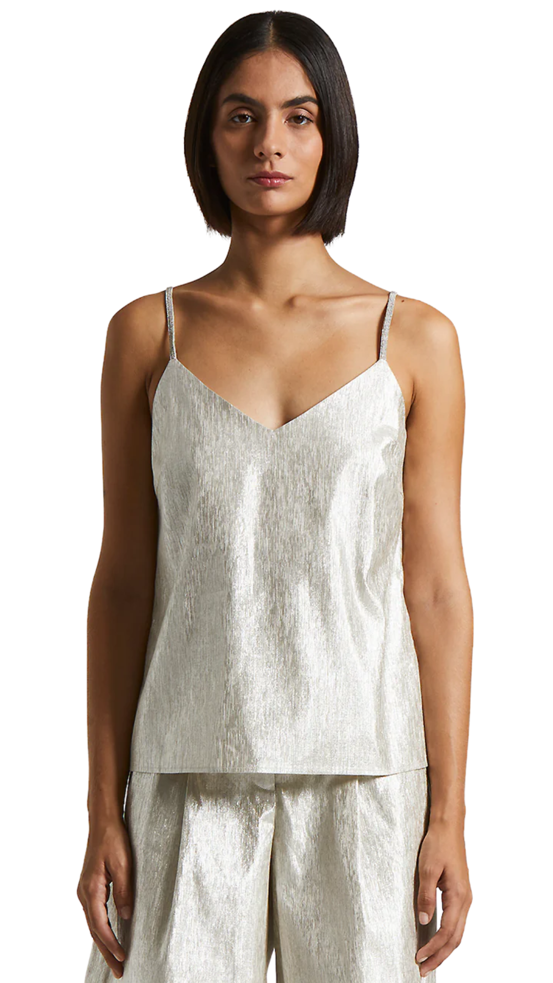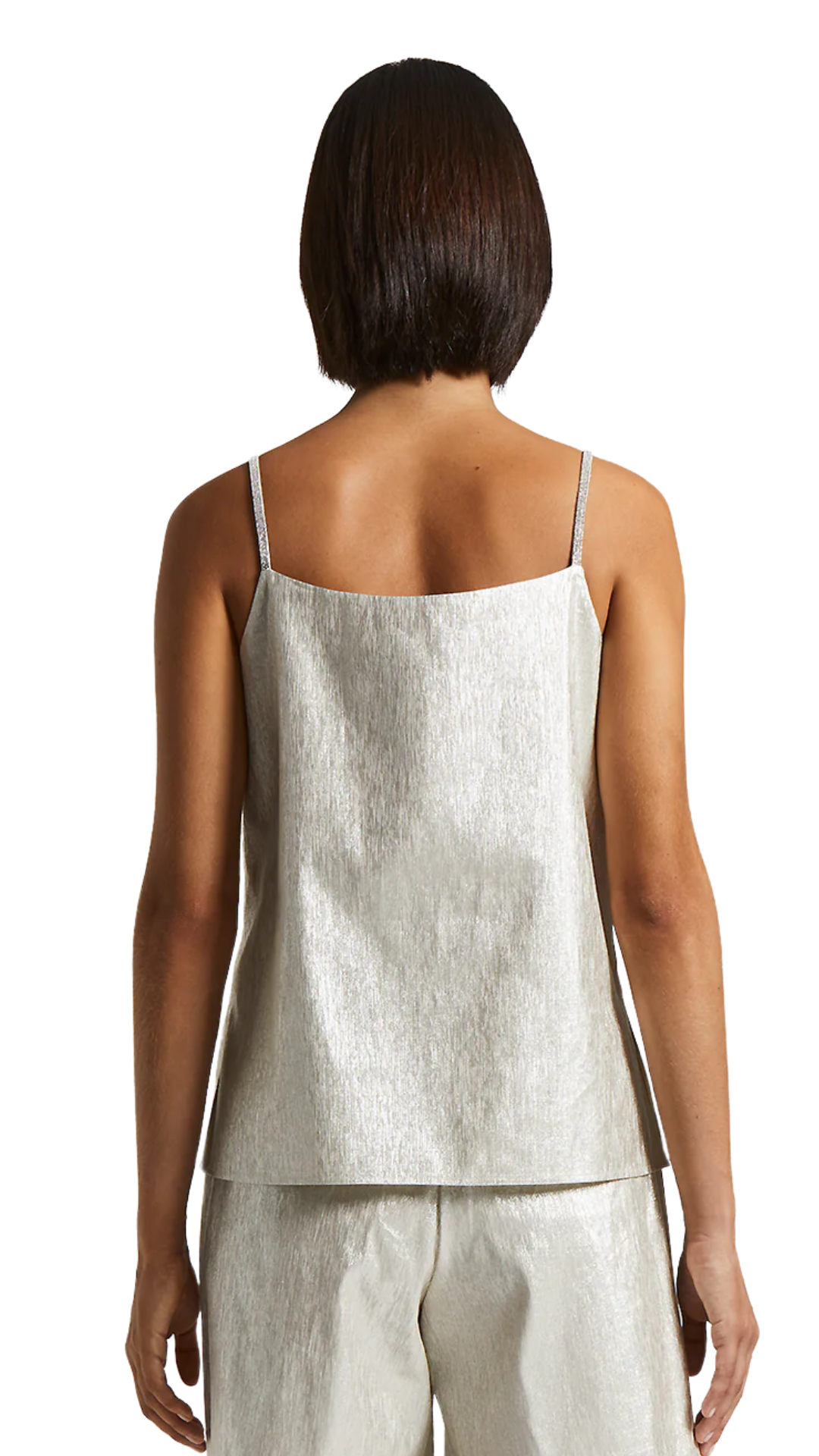 V-neck top in metallic-effect linen cotton, which highlights the look with a bright touch of sophistication.